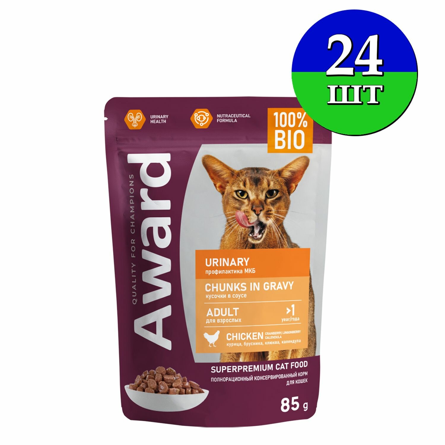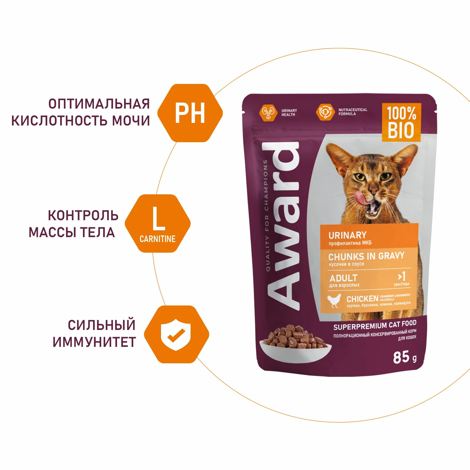 AWARD Полнорационный консервированный корм «Urinary» для профилактики мочекаменной болезни у взрослых кошек, кусочки в соусе с курицей 85 г. ; Полнорационный сбалансированный корм для взрослых кошек, помогающий снизить риск рецидива образования кристаллов и камней струвитного типа в мочевом пузыре. ; Корм изготовлен из 100% натуральных ингредиентов по инновационной формуле — это обеспечивает комплексную нутрицевтическую поддержку организма питомца. ; В состав корма включена клюква — суперфуд, способствующий правильной работе мочевыводящих путей. ; Корм содержит таурин – незаменимую аминокислоту для поддержания работы сердечно-сосудистой системы, нервной системы, печени, почек и мозга. ; Без красителей и консервантов.