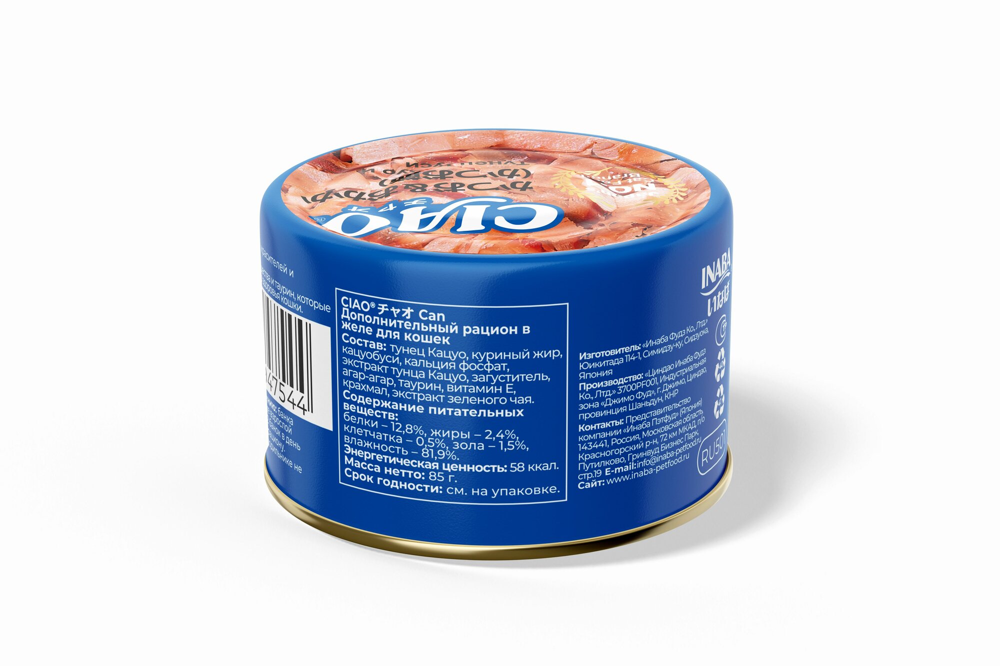 тунец Кацуо, тунец Магуро, крахмал, экстракт тунца Кацуо, агар-агар, загуститель, экстракт зеленого чая, краситель (красный ферментированный рис). Белки: более 10,0%, жиры: более 0,5%, клетчатка: менее 0,1%, минералы: менее 1,2%, вода: менее 88,0% Энергетическая ценность: 40 ккал/пауч