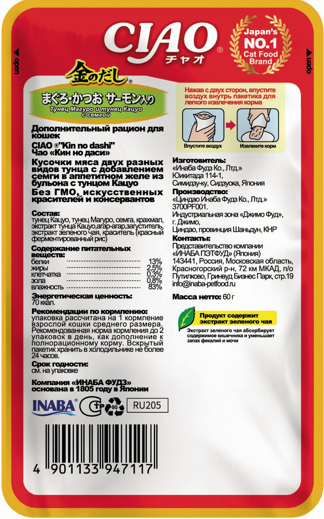 Купить Влажный корм CIAO Kinnodashi для кошек Тунец Магуро и тунец Кацуо с сёмгой, паучи 12 x 60г с доставкой по всей России. Влажный корм CIAO Kinnodashi для кошек Тунец Магуро и тунец Кацуо с сёмгой, паучи 12 x 60г: сравнение цен, характеристики, фото, актуальное наличие и цены.