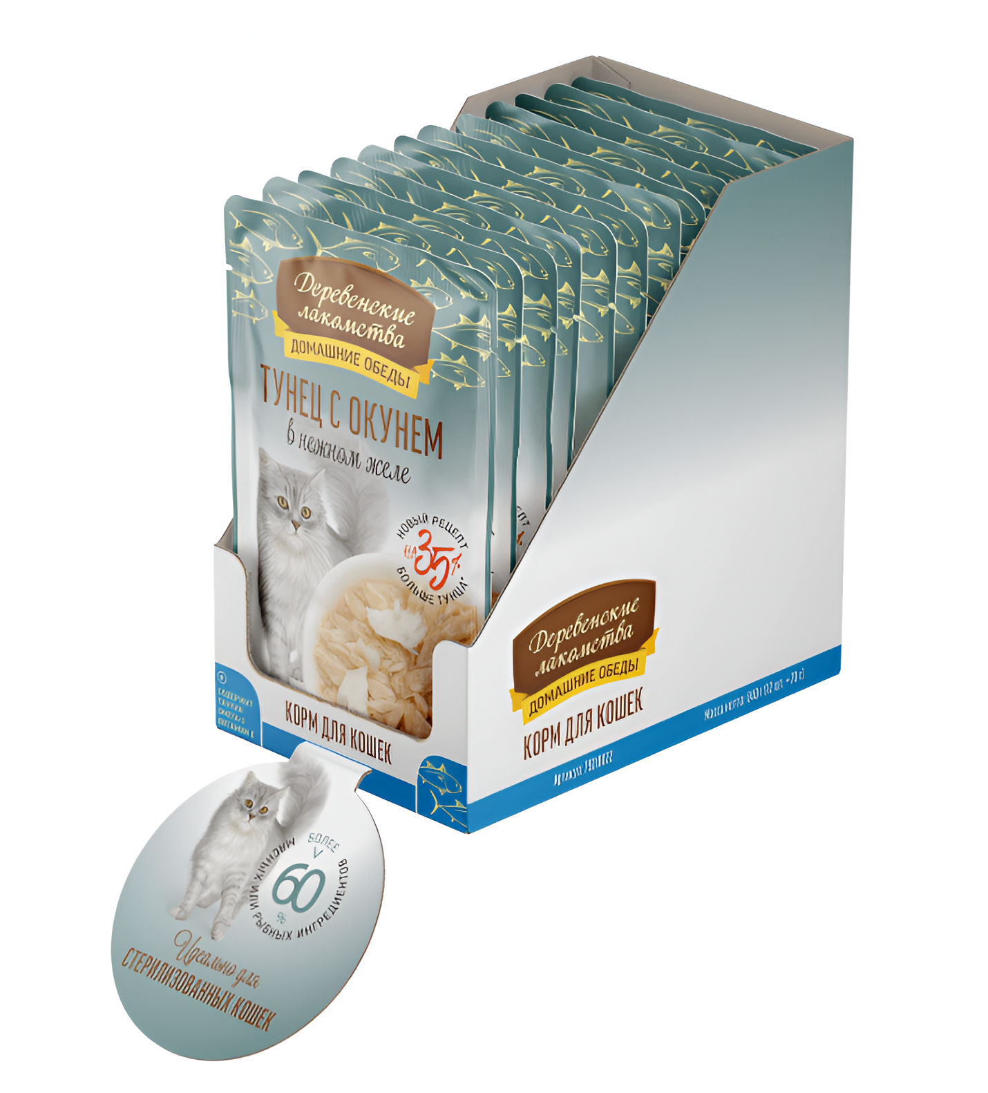 Влажный корм Деревенские Лакомства «Домашние Обеды», тунец и окунь в нежном желе 70 г х 12 шт, пауч: сравнение цен, характеристики, фото, актуальное наличие и цены.