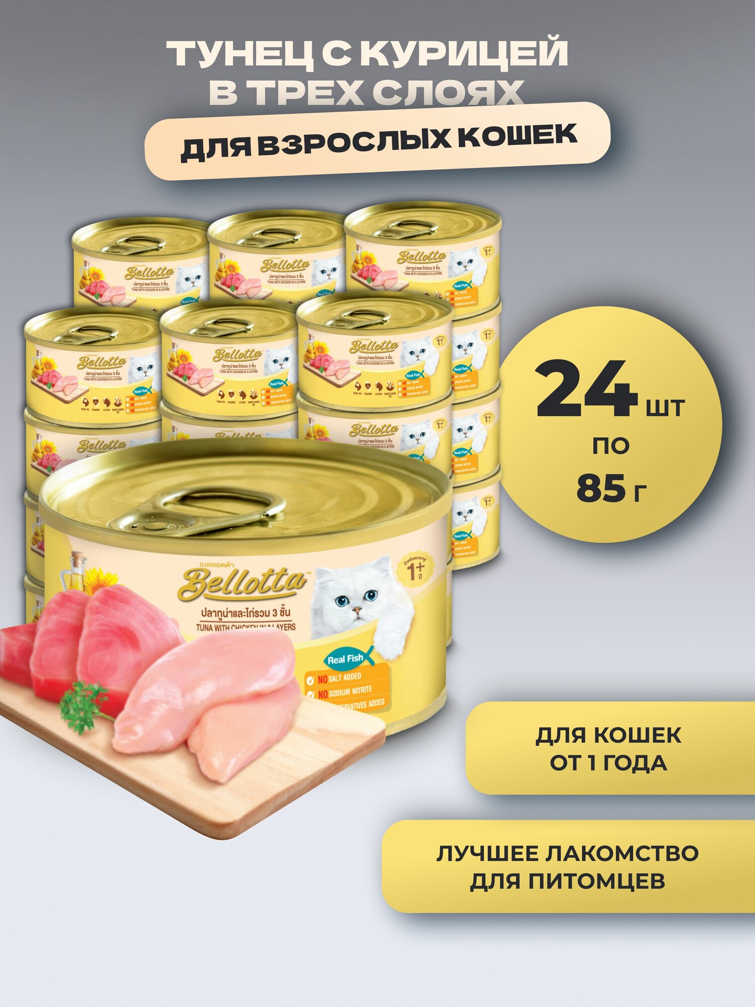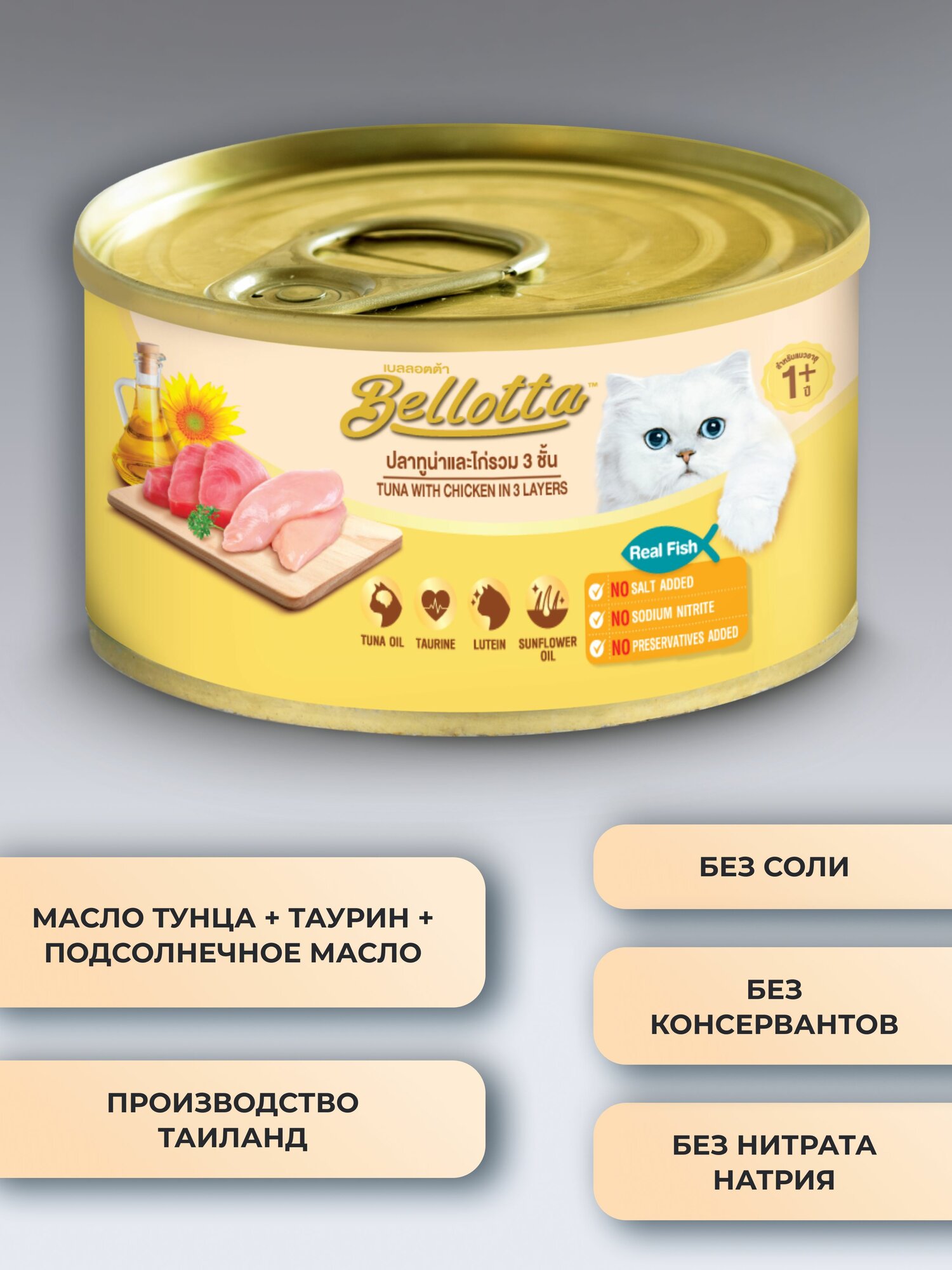 Влажный корм для кошек «Bellotta» Тунец с курицей в трех слоях, консервы 24 штуки по 85г: сравнение цен, характеристики, фото, актуальное наличие и цены.