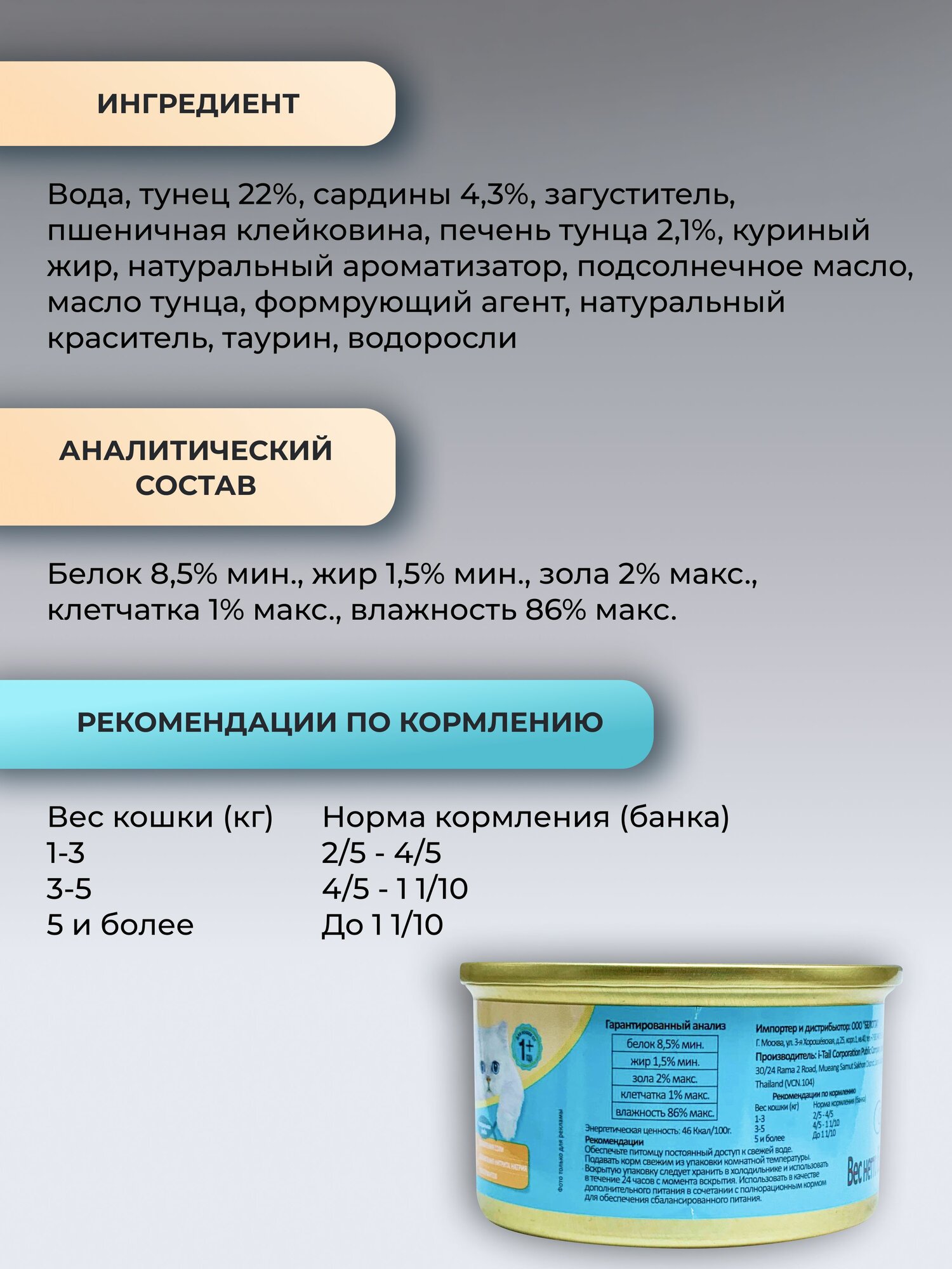 Побалуйте свою любимую кошку изысканным вкусом Таиланда! Наш премиальный тайский корм для кошек с высоким содержанием тунца и морепродуктов — это гастрономическое наслаждение, которое перенесет вкусовые рецепторы вашего питомца в настоящий рай. Каждое лакомство наполнено отборным тунцом и неотразимой смесью морепродуктов, обеспечивая полноценное и питательное питание. Мы используем только самые свежие ингредиенты, чтобы ваш котик мог наслаждаться неповторимым вкусом и ароматом Таиланда. Наша удобная упаковка сохраняет первозданную свежесть и аппетитность корма, гарантируя легкую подачу и удобное хранение. Ключевые особенности: • Высокое содержание белка для поддержания здоровой мышечной массы • Источник незаменимых жирных кислот омега-3 и омега-6 для блестящей шерсти и здоровой кожи • Таурин для острого зрения и крепкого сердца • Беззерновой состав, подходящий для кошек с чувствительным пищеварением Подарите своей кошке королевское угощение с нашим премиальным тайским кормом для кошек с высоким содержанием тунца и морепродуктов в удобной упаковке. Пусть каждый прием пищи станет истинным гастрономическим приключением!