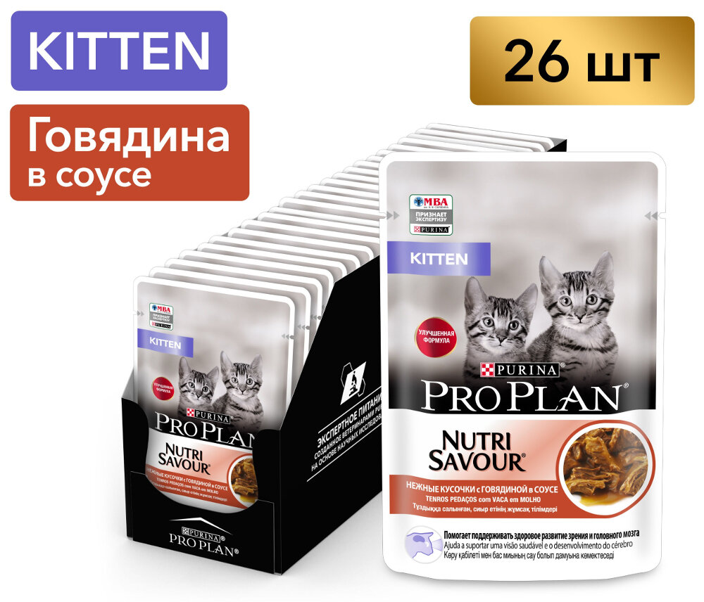 Purina Pro Plan Паучи Кусочки в соусе для котят с говядиной (Junior) 26шт. 2.21 кг: сравнение цен, характеристики, фото, актуальное наличие и цены.