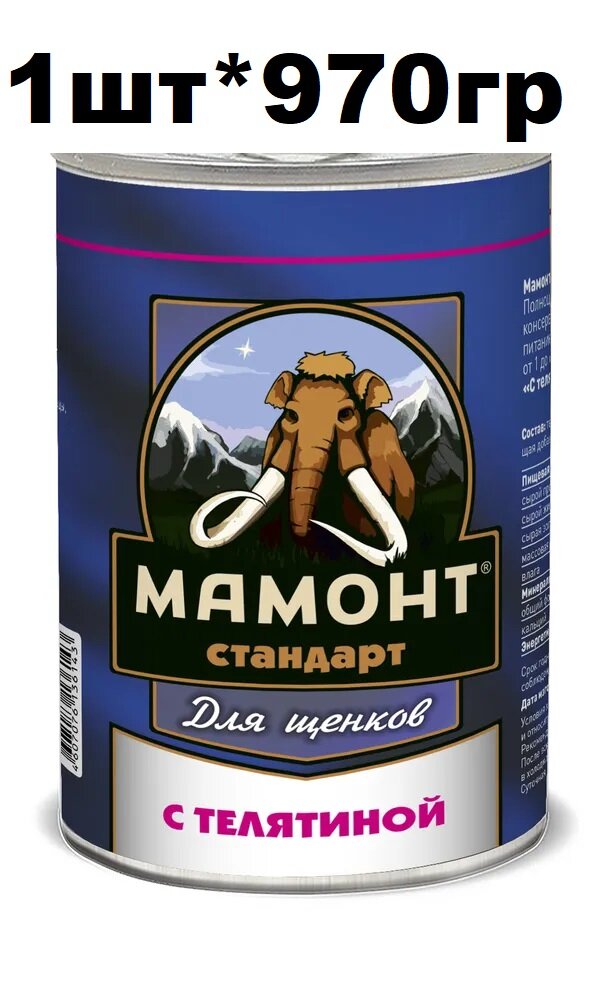 Влажный корм для щенков с телятиной, Мамонт Стандарт, упаковка1 шт х 970 г: сравнение цен, характеристики, фото, актуальное наличие и цены.