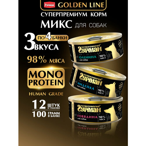 Купить Влажный корм для собак Четвероногий Гурман Golden line, микс (Говядина, Индейка, Оленина), 100 г х 12 шт. с доставкой по всей России. Влажный корм для собак Четвероногий Гурман Golden line, микс (Говядина, Индейка, Оленина), 100 г х 12 шт.: сравнение цен, характеристики, фото, актуальное наличие и цены.
