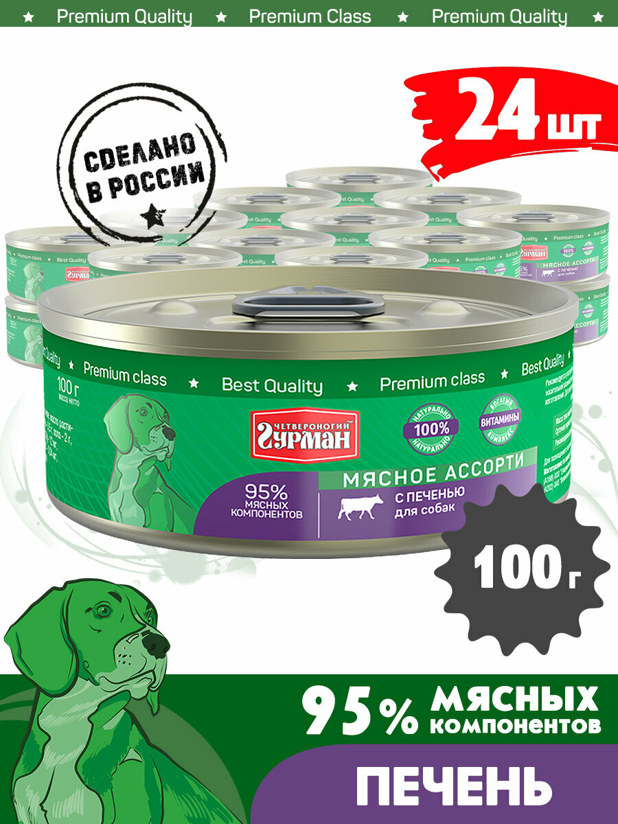 Четвероногий гурман “Мясное ассорти” для собак – это влажный корм премиум класса с фаршевой консистенцией. В его составе 95% мясных компонентов исключительно высшего качества. Рецептуры корма богаты ингредиентами – мясо и всевозможные субпродукты обеспечивают лакомый вкус, притягательный аромат, высокую питательность, а также насыщенный комплекс витаминов и минералов. Корм полностью натуральный – в его составе нет искусственных красителей, ароматизаторов, усилителей вкуса и ГМО.“Мясное ассорти” подходит для собак всех пород для ежедневного кормления или как дополнение к основному рациону. При этом рекомендуется смешивать консервы с “Моментальными кашами” Четвероногий гурман. Состав: печень, рубец, говядина, легкое, вода, масло подсолнечное, желирующая добавка, клетчатка, соль. Пищевая ценность (в 100 г продукта): протеин – 11 г, жир – 6,7 г, клетчатка – 0,5 г, зола – 2 г, влага – 82 г. Минеральные вещества (в 100 г продукта): P – 119 мг, Ca – 10 мг, Na – 162 мг, Cl – 201 мг, K – 210 мг, Mg – 12 мг, Fe – 4,4 мг, Cu – 342 мкг, Co – 3 мкг, Mn – 36 мкг, I – 5 мкг. Витамины (в 100 г продукта): А – 1138 МЕ, Е – 0,7 МЕ, В1 – 0,04 мг, В2 – 0,26 мг, В3 – 2,11 мг, В5 – 0,52 мг, В6 – 0,08 мг. Энергетическая ценность (на 100 г): 105 ккал. Норма кормления: 70 – 90 г на 1 кг веса животного. Суточную норму разделить на два приема кормления. Употреблять при комнатной температуре.