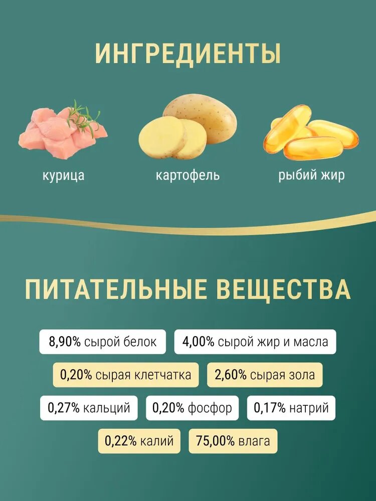 Состав: куриное филе, гидролизованный рыбный белок, сладкий картофель, куриная печень, рыбий жир, рыба (сардина и тунец), вареные куриные яйца, семена киноа, куриный жир, свинина, ягненок, говядина, утка, дикальцийфосфат, карбонат кальция, семена льна, калий хлорид, фруктоолигосахариды (0.25%), дрожжевой экстракт (источник мананоолигосахаридов) (0,15%), хлорид натрия, сухие пивные дрожжи.