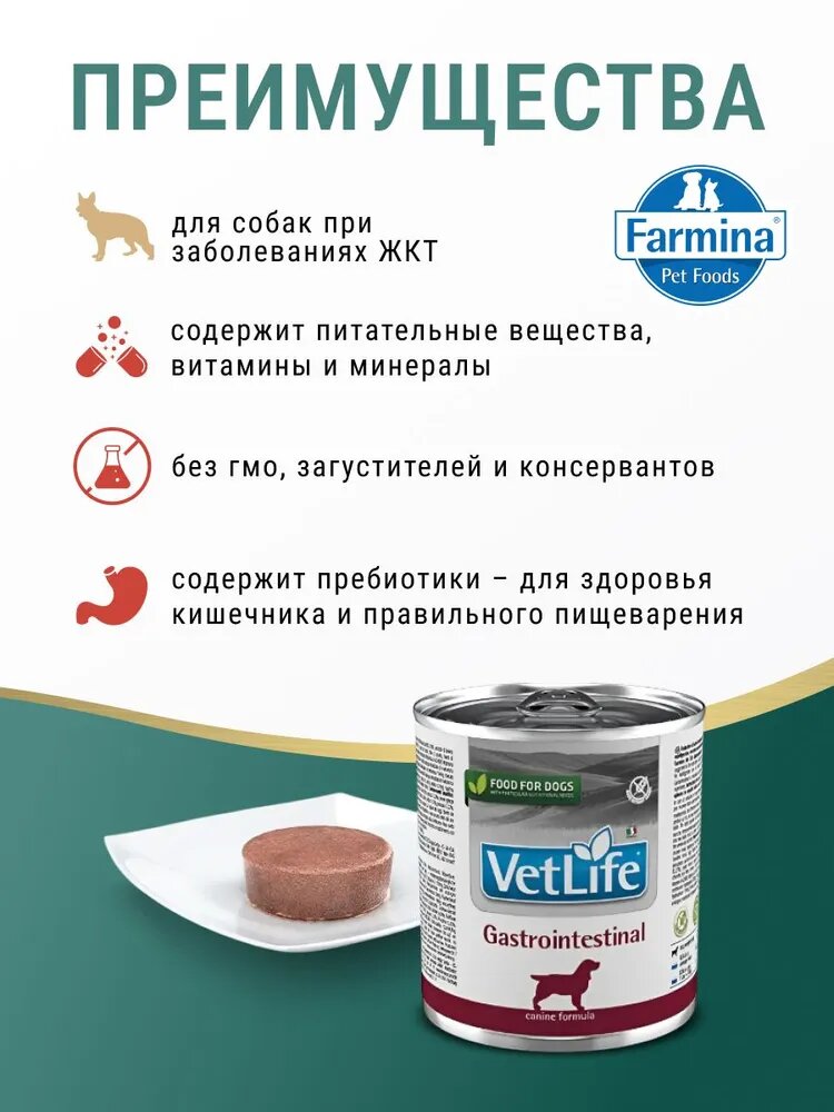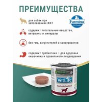 Farmina Vet Life Gastrointestinal это полнорационный диетический влажный корм для собак при нарушении пищеварения и всасывания в кишечнике (мальабсорбция/мальдигестия), для компенсации недостаточности пищеварения и экзокринной недостаточности поджелудочной железы
