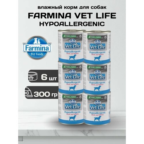 Влажный корм Farmina Vet Life Hypoallergenic предназначен для собак с пищевой аллергией, непереносимостью, кожными проблемами (зуд, дерматиты, отит) или для диагностических исключающих диет; он использует ограниченные источники белка (утка) и углеводов (картофель) для минимизации аллергических реакций и улучшения здоровья кожи, глаз, ушей.