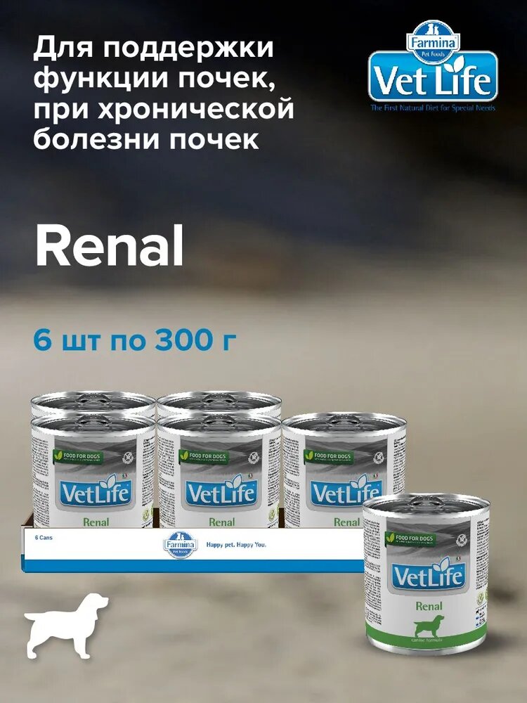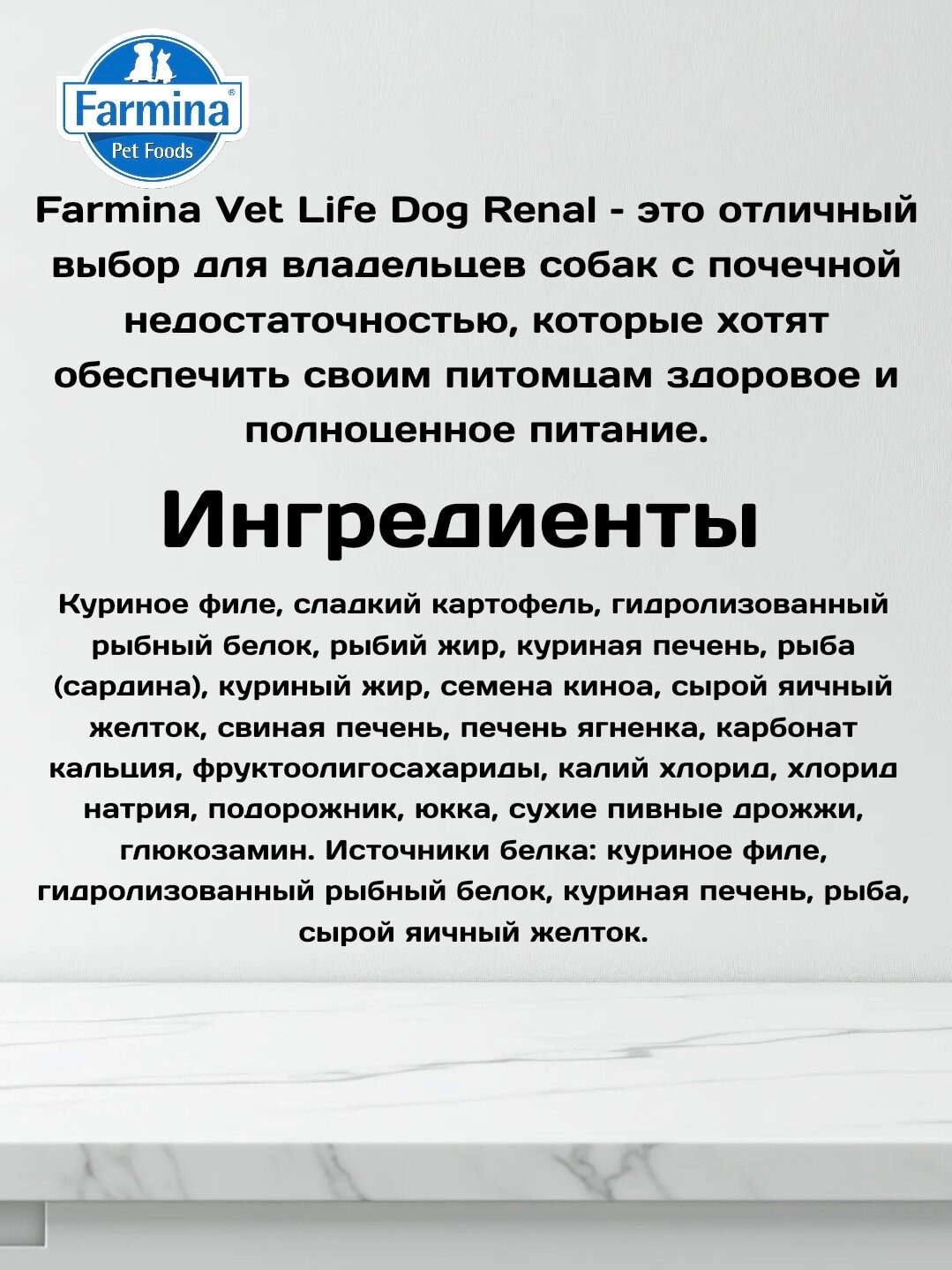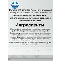 Farmina Vet Life Renal - это полнорационный диетический корм для собак для поддержки функции почек при хронической болезни почек или при временных нарушениях почечной функции.