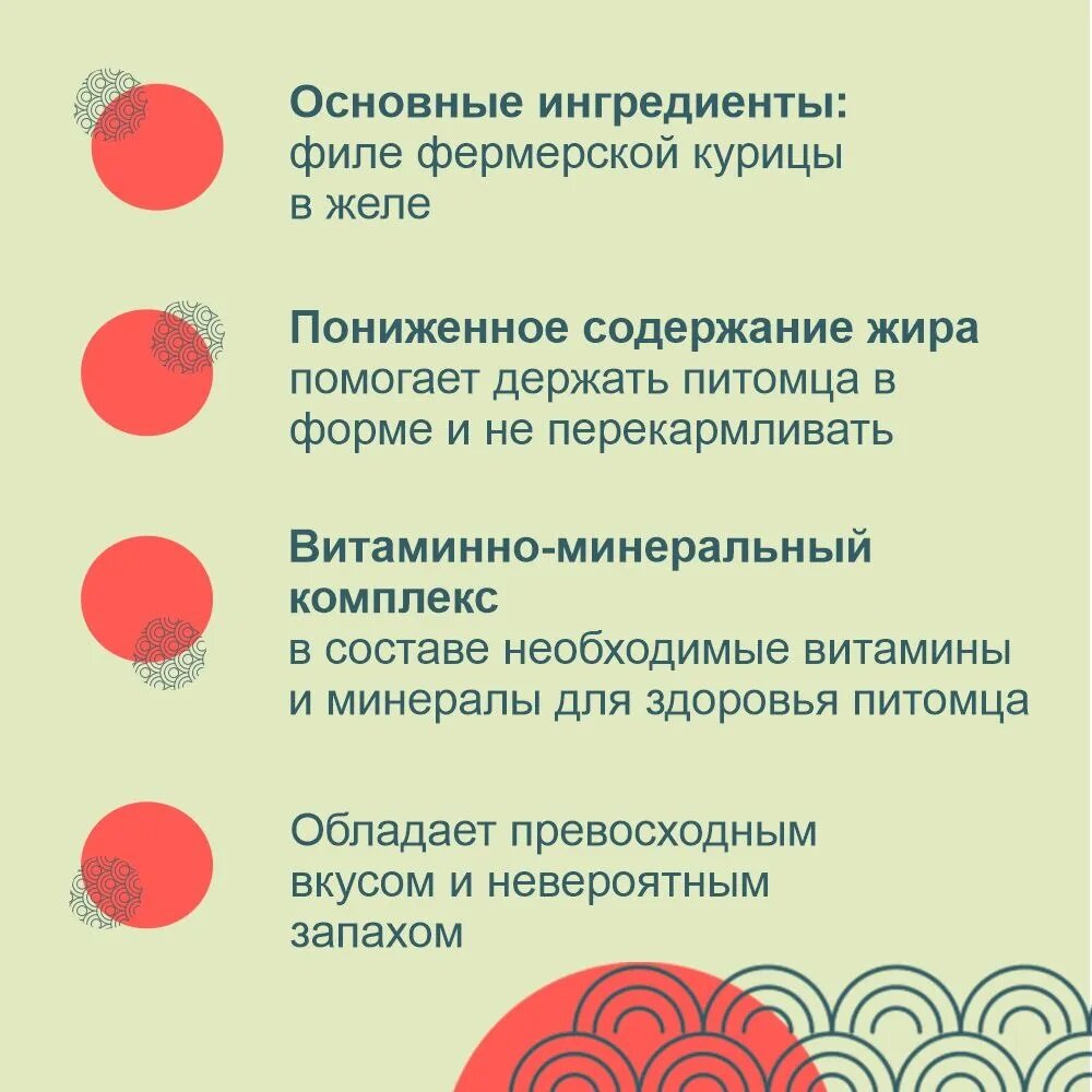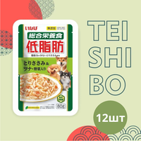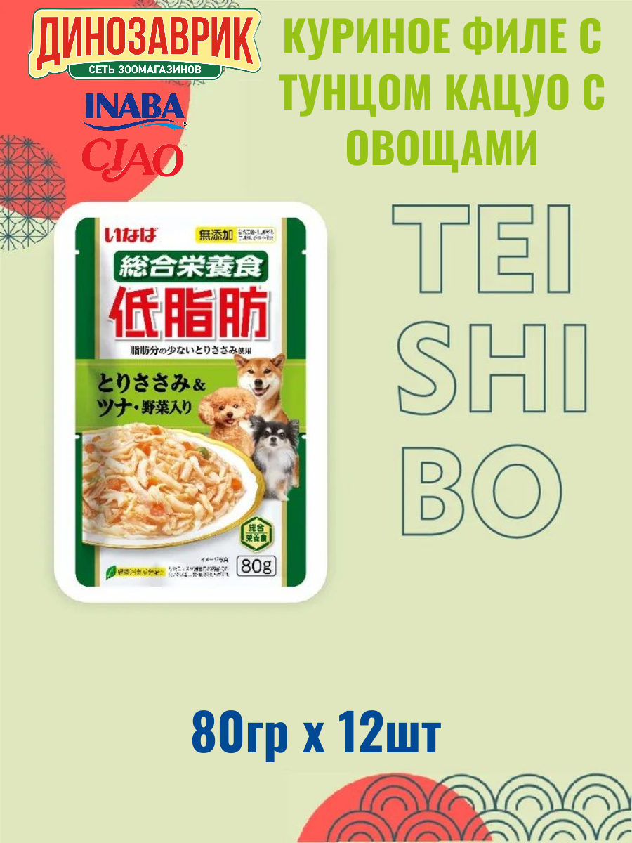 В состав кормов и лакомств INABA Teishibo входят натуральные, отборные, традиционные японские ингредиенты, помогающие поддерживать здоровье питомца. Корма и лакомства инаба тэисибо для собак и кошек содержат необходимые аминокислоты, витамины и минеральные вещества, которые способствуют поддержанию здоровья собак. Высокий уровень влажности в кормах INABA для собак позволяет не допустить нарушения водного баланса в организме питомца. В составе кормов INABA содержится экстракт зеленого чая, способствующий уменьшению запаха фекалий и мочи у питомца. Корма INABA CIAO изготавливаются из ингредиентов, которые являются источником энергии и молодости, так как они богаты имидазолсодержащими дипептидами. Вид корма: INABA Teishibo Куриное филе и говядина в желе. Состав: куриное филе, говядина, куриный жир, крахмал, экстракт курицы, агар-агар, соевое масло, минералы (Ca, Fe, Cu, Mn, Zn, I, K, Mg, Se), загуститель, витамины (A, D3, E, B1, B2, B6, B9, B12, холин, B7), экстракт зеленого чая, красный ферментированный рис. Содержание питательных веществ: белки – не менее 9,5%, жиры – не менее 1,5%, клетчатка – не более 0,1%, зола – не более 1,5%, влажность – не более 87%. Энергетическая ценность – 65 ккал. INABA Teishibo Куриное филе и куриная печень в желе. Состав: куриное филе, куриная печень, куриный жир, крахмал, экстракт курицы, агар-агар, соевое масло, минералы (Ca, Fe, Cu, Mn, Zn, I, K, Mg, Se), загуститель, витамины (A, D3, E, B1, B2, B6, B9, B12, холин, B7), экстракт зеленого чая, красный ферментированный рис. Содержание питательных веществ: белки – не менее 8,5%, жиры – не менее 1,5%, клетчатка – не более 0,1%, зола – не более 1,5%, влажность – не более 88%. Энергетическая ценность – 60 ккал. INABA Teishibo Куриное филе и овощи в желе. Состав: куриное филе, овощи (морковь, тыква, зеленый горошек), куриный жир, крахмал, экстракт курицы, агар-агар, соевое масло, минералы (Ca, Fe, Cu, Mn, Zn, I, K, Mg, Se), загуститель, витамины (A, D3, E, B1, B2, B6, B9, B12, холин, B7), экстракт зеленого чая, красный ферментированный рис. Содержание питательных веществ: белки – не менее 7,5%, жиры – не менее 1,3%, клетчатка – не более 0,3%, зола – не более 1,5%, влажность – не более 88%. Энергетическая ценность – 55 ккал. INABA Teishibo Куриное филе и куриные хрящи в желе. Состав: куриное филе, куриные хрящи, куриный жир, крахмал, экстракт курицы, агар-агар, соевое масло, минералы (Ca, Fe, Cu, Mn, Zn, I, K, Mg, Se), загуститель, витамины (A, D3, E, B1, B2, B6, B9, B12, холин, B7), экстракт зеленого чая, красный ферментированный рис. Содержание питательных веществ: белки – не менее 8%, жиры – не менее 2%, клетчатка – не более 0,2%, зола – не более 1,5%, влажность – не более 87%. Энергетическая ценность – 65 ккал. INABA Teishibo Куриное филе и тунец Кацуо с овощами в желе. Состав: куриное филе, овощи (морковь, тыква, зеленый горошек), тунец Кацуо, куриный жир, крахмал, экстракт курицы, агар-агар, соевое масло, минералы (Ca, Fe, Cu, Mn, Zn, I, K, Mg, Se), загуститель, витамины (A, D3, E, B1, B2, B6, B9, B12, холин, B7), экстракт зеленого чая, красный ферментированный рис. Содержание питательных веществ: белки – не менее 8,5%, жиры – не менее 1,3%, клетчатка – не более 0,3%, зола – не более 1,5%, влажность – не более 87,5%. Энергетическая ценность – 60 ккал. Особенности серии: волокна в желе, в основе корма филе фермерской курицы, низкое содержание жира, обогащенный витаминами и минералами состав, без искусственных красителей, консервантов, вкусовых и ароматических добавок, подсластителей, полнорационный корм. Срок годности: 2 г