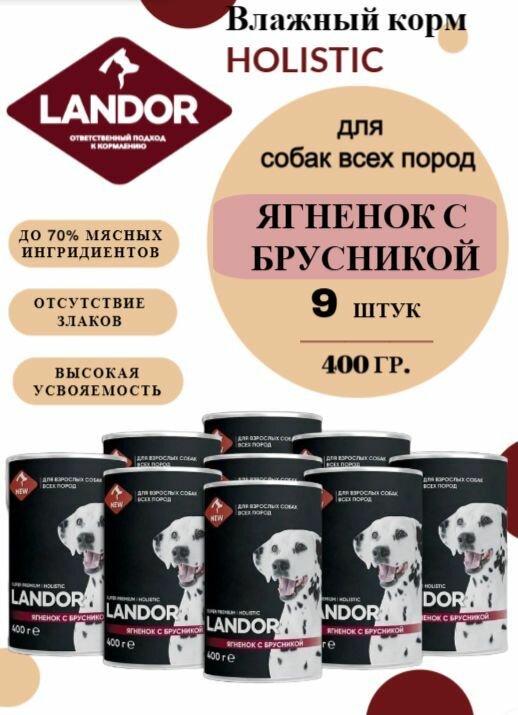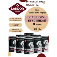 Полнорационный влажный корм LANDOR для собак всех пород, ягненок с брусникой, 400г х 9шт.