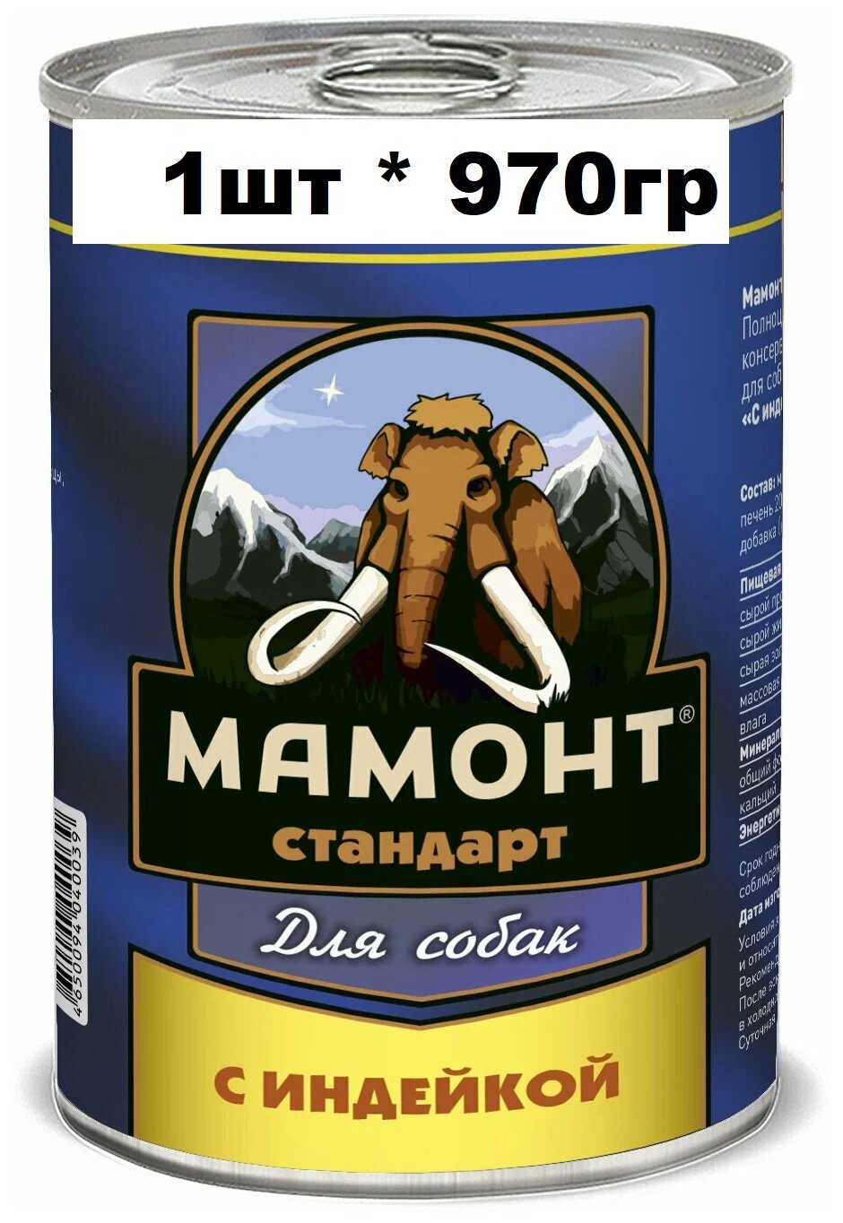 Влажный корм для собак с индейкой, Мамонт Стандарт, упаковка 1 шт х 970 г