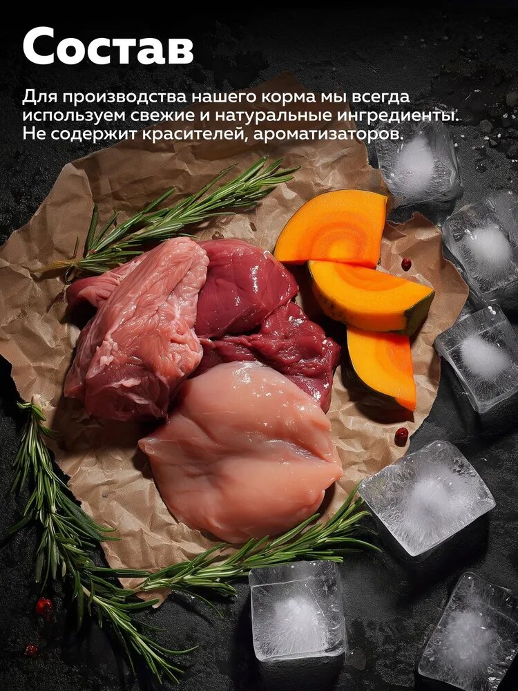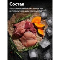 Состав: мясо индейки, субпродукты мясные (печень, рубец, лёгкое), морковь, тыква, желирующая добавка, подсолнечное масло, рыбий жир (источники омега 3-6-9), пивные дрожжи, сушеная мякоть свеклы, витаминно-минеральный комплекс, хондроитин и глюкозамин, вода.