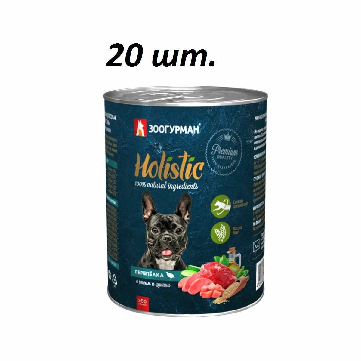 Влажный корм для собак зоогурман холистик (HOLISTIC) Гипоаллергенный корм класса Holistic. Не содержит кукурузы, пшеничного глютена, сои, лактозы. В составе используются только натуральные ингредиенты, обеспечивающие хорошее самочувствие и долголетие вашего питомца. Перепёлка С рисом И цукини Состав: мясо перепёлки, мясо индейки, субпродукты птицы, бульон из перепёлки, рис, цукини, морковь, масло растительное, желирующая добавка, рыбий жир, пивные дрожжи, морские водоросли, экстракт Юкка Шидигера Пищевая ценность (100г): сырой протеин - не менее 8,0г; сырой жир - не более 10,0г; клетчатка - не более 1,0г; сырая зола - не более 2,0г; влага - не более 82%. Минеральные вещества и витаминный комплекс: витамин А не менее 2670МЕ/кг, витамин D3 - не менее 303МЕ/кг, витамин Е - не менее 10мг/кг, фосфор не более 5г/кг, кальций не более 4г/кг, цинк - не менее 15мг/кг, железо - не менее 6,50мг/кг, йод - не менее 0,38мг/кг, медь - не менее 1,77мг/кг, марганец - не менее 1,13мг/кг, селен - не менее 0,03мг/кг. Энергетическая ценность: 101 ккал/100г. Срок годности: не более 3-х лет с даты изготовления при соблюдении условий хранения. Условия хранения: хранить при температуре от 0 C до +25 C и относительной влажности воздуха не более 75%. После вскрытия потребительской упаковки продукт хранить в холодильнике не более 2-х суток. Суточная норма: 30-50г на 1кг веса животного. Перед кормлением рекомендуется довести продукт до комнатной температуры. У животного всегда должен быть доступ к свежей питьевой воде.
