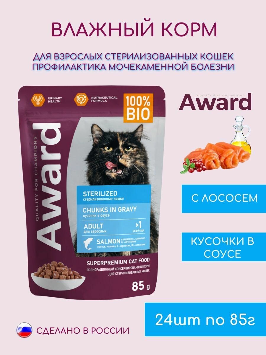 Купить Влажный корм для стерилизованных кошек Award Sterilized 85г*24шт Кусочки в соусе с лососем с доставкой по всей России. Влажный корм для стерилизованных кошек Award Sterilized 85г*24шт Кусочки в соусе с лососем: сравнение цен, характеристики, фото, актуальное наличие и цены.