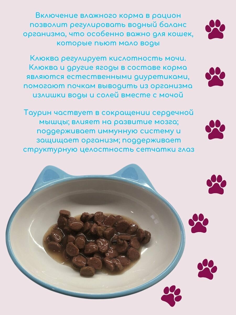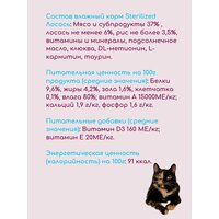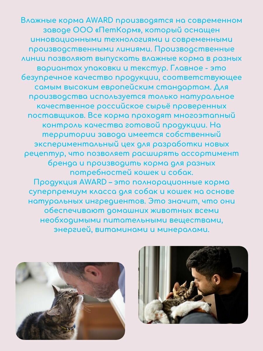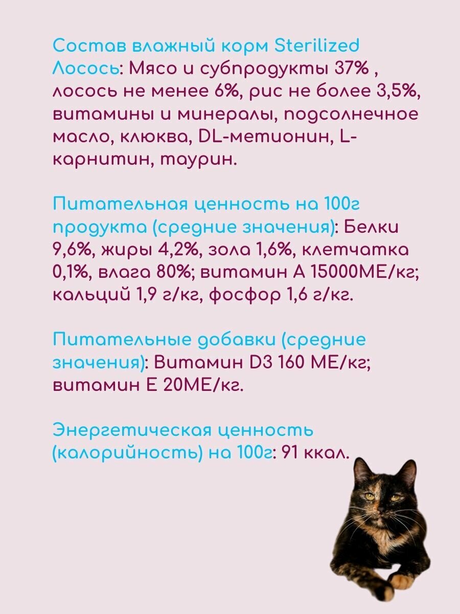 AWARD Полнорационный консервированный корм «Sterilized» для взрослых стерилизованных кошек, кусочки в соусе с лососем 85 г * 24 шт. Корм изготовлен из 100% натуральных ингредиентов по инновационной формуле — это обеспечивает комплексную нутрицевтическую поддержку организма питомца. Включение влажного корма в рацион позволит регулировать водный баланс организма, что особенно важно для кошек, которые пьют мало воды. В состав корма включена клюква — суперфуд, способствующий правильной работе мочевыводящих путей. Это особенно важно для стерилизованных кошек. Корм содержит таурин – незаменимую аминокислоту для поддержания работы сердечно-сосудистой системы, нервной системы, печени, почек и мозга. Без красителей и консервантов. Состав: Мясо и субпродукты 37% , лосось не менее 6%, рис не более 3,5%, витамины и минералы, подсолнечное масло, клюква, DL-метионин, L-карнитин, таурин. Питательная ценность на 100 г продукта (средние значения): белки 9,6%, жиры 4,2%, зола 1,6%, клетчатка 0,1%, влага 80%. Витамины и минералы: витамин А 1500ME/кг; витамин D3 160 МЕ/кг; витамин Е 20ME/кг, кальций 1,9 г/кг, фосфор 1,6 г/кг. Энергетическая ценность (калорийность) на 100г: 91 ккал. Противопоказания: Индивидуальная непереносимость компонентов состава корма. При кормлении необходимо учитывать возраст и активность питомца. Суточная норма кормления указана в таблице на упаковке или на сайте. У питомца всегда должен быть доступ к свежей питьевой воде. Перед употреблением рекомендуется проконсультироваться с ветеринарным врачом.