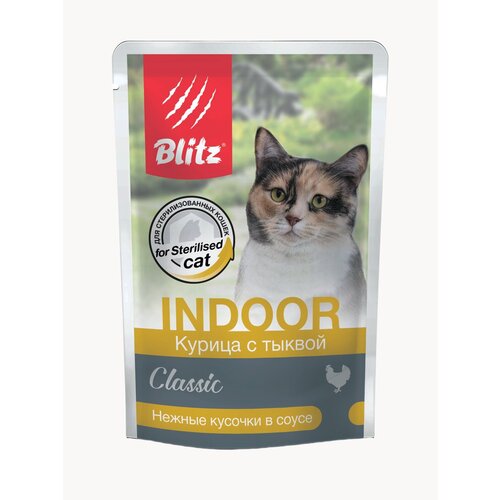 Паучи Блиц для Стерилизованных кошек Курица с тыквой кусочки в соусе (цена за упаковку) - Если ваша кошка обожает курочку, любит сочные кусочки и нуждается в деликатной поддержке пищеварения, влажный корм Blitz Classic Sterilised Cat Chicken & Pumpkin – идеальный выбор для каждодневного питания. На 85% консервы состоят из мясных компонентов, включая куриное филе и ценные субпродукты – печень, сердце, лёгкие и пр. Животный белок содержит жизненно важные для кошек аминокислоты и придаёт исключительную питательность влажному рациону. Входящие в рецептуру тыква и топинамбур – наиболее полезные для кошек овощи, они хорошо воспринимается животными и содержат полезную для кишечника клетчатку – пектин и инулин. Кроме этого, корм Blitz Classic «Курица с тыквой» отличается и повышенным содержанием бета-каротина – неизменным спутником всех овощей оранжевого цвета. Он улучшает зрение, шерстный покров и сопротивляемость организма инфекциям. Влажный корм Blitz Classic Sterilised Cat Chicken & Pumpkin in Gravy, нежные кусочки в соусе, разработан специально для кастрированных котов и кошек, прошедших стерилизацию: он тщательно сбалансирован по минеральным веществам, обладает оптимальной влажностью и содержит добавки, препятствующие ожирению. Состав: Мясо и субпродукты (из них курица не менее 27%), тыква (не менее 4%), злаки (не более 3%), клюква, DL-метионин, витамины, минеральные вещества, таурин, топинамбур, экстракт Юкки, L-карнитин. Анализ: Белок 8 %; Жир 3 %; Клетчатка 0,3 %; Влажность 83 %; Зола 1,4 %; Витамин А 5000 МЕ/кг; Витамин Е 7 МЕ/кг; Витамин Д3 100 МE/кг; Таурин 700 мг/кг.