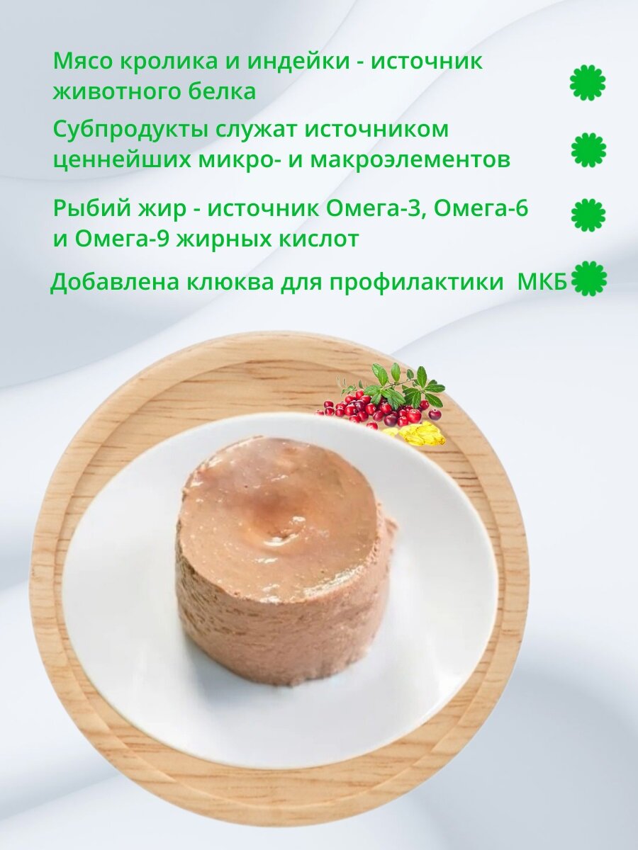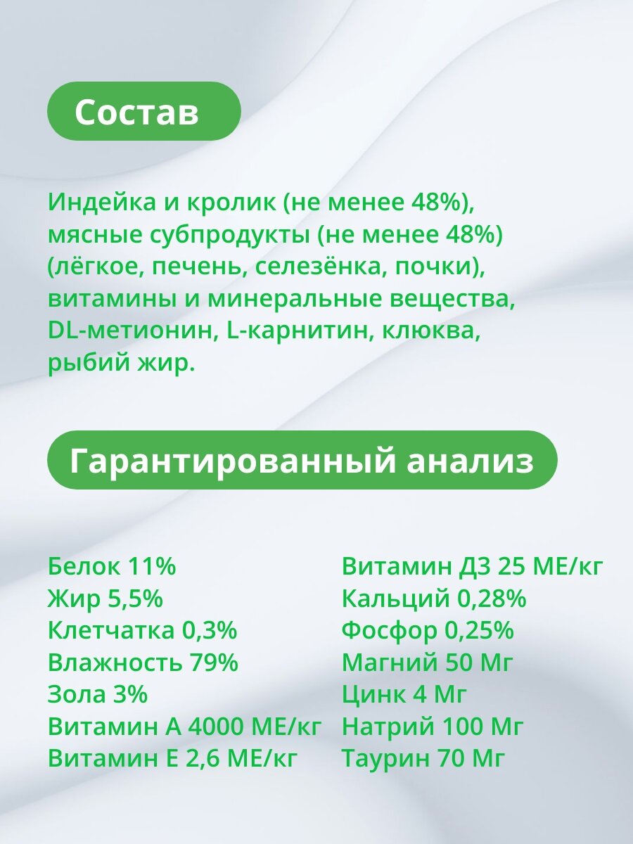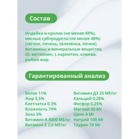 Состав корма включает в себя индейку и кролика (не менее 48%), а также мясные субпродукты (не менее 48%) (лёгкое, печень, селезёнка, почки), витамины и минеральные вещества. В корме также присутствуют DL-метионин, L-карнитин и клюква, а также рыбий жир.