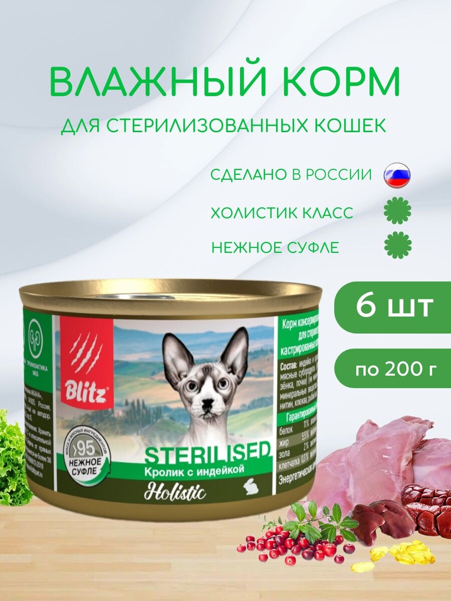 Купить Влажный корм для стерилизованных кошек Blitz Holistic 200г*6шт Кролик с индейкой с доставкой по всей России. Влажный корм для стерилизованных кошек Blitz Holistic 200г*6шт Кролик с индейкой: сравнение цен, характеристики, фото, актуальное наличие и цены.