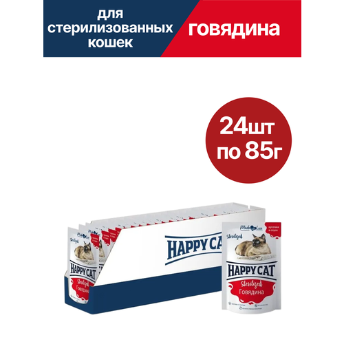 Купить Влажный корм для стерилизованных кошек Happy Cat (Хэппи Кэт), кусочки в соусе, говядина, 24 шт по 85 гр с доставкой по всей России. Влажный корм для стерилизованных кошек Happy Cat (Хэппи Кэт), кусочки в соусе, говядина, 24 шт по 85 гр: сравнение цен, характеристики, фото, актуальное наличие и цены.