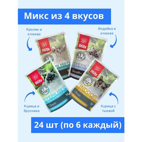Купить Влажный корм для стерилизованных кошек микс из 4 вкусов Blitz 85г*24шт Курица, индейка, кролик с доставкой по всей России. Влажный корм для стерилизованных кошек микс из 4 вкусов Blitz 85г*24шт Курица, индейка, кролик: сравнение цен, характеристики, фото, актуальное наличие и цены.