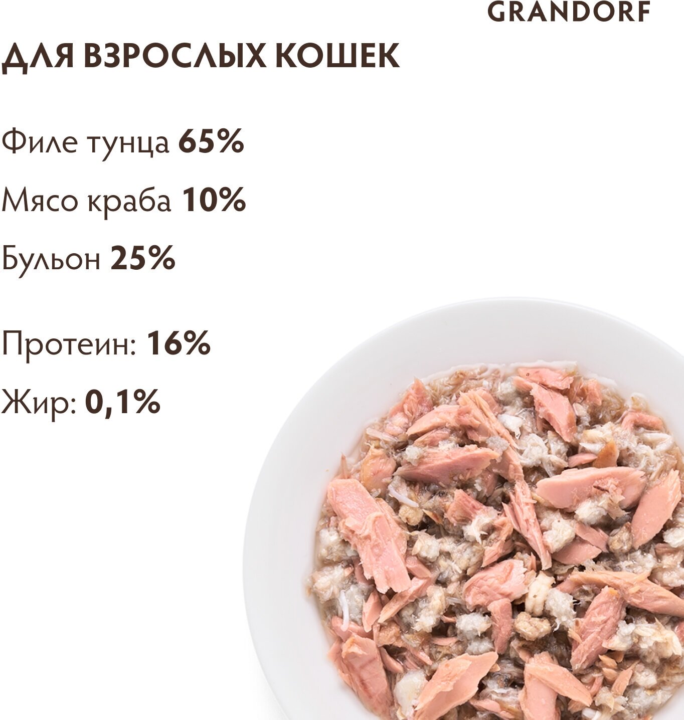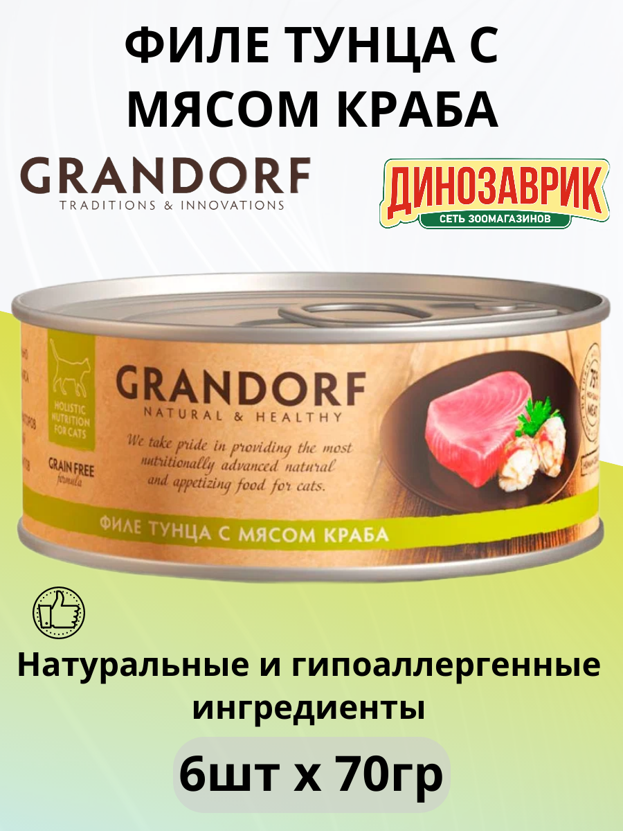 Купить Влажный корм Grandorf для кошек филе тунца с мясом краба, 6 шт х 70 г с доставкой по всей России. Влажный корм Grandorf для кошек филе тунца с мясом краба, 6 шт х 70 г: сравнение цен, характеристики, фото, актуальное наличие и цены.