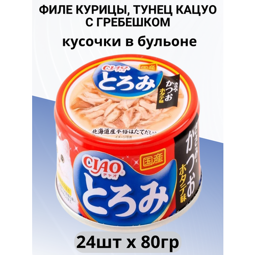 Купить Влажный корм Inaba CIAO TOROMI для любых кошек, Филе курицы, тунец кацуо с гребешком в бульоне (банка) 24 шт х 80г с доставкой по всей России. Влажный корм Inaba CIAO TOROMI для любых кошек, Филе курицы, тунец кацуо с гребешком в бульоне (банка) 24 шт х 80г: сравнение цен, характеристики, фото, актуальное наличие и цены.