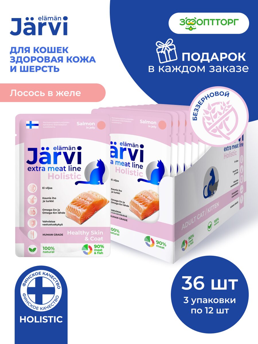 Влажный корм Jarvi Extra meat line для кошек для красивой шерсти и здоровой кожи (кусочки в желе) Лосось, 85 г х 36 шт.: сравнение цен, характеристики, фото, актуальное наличие и цены.