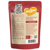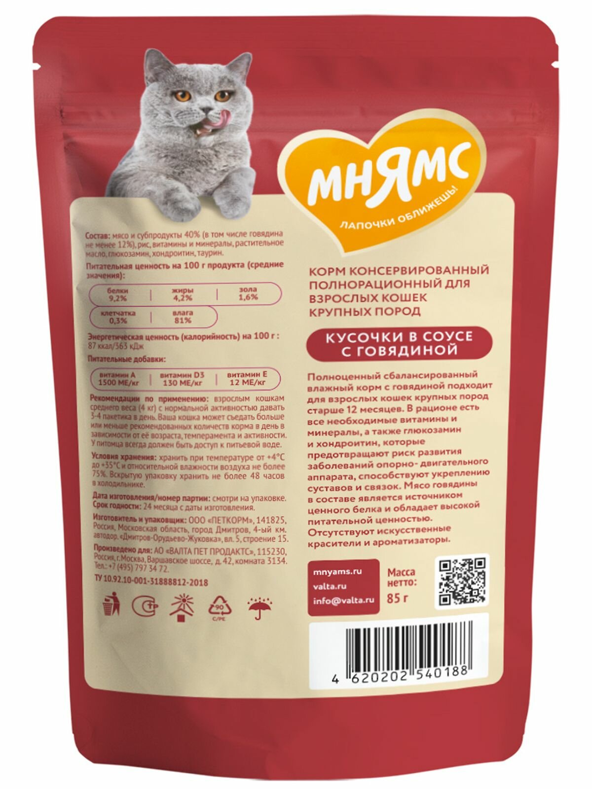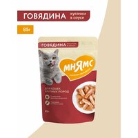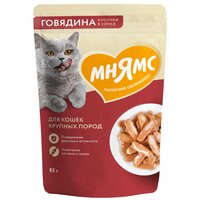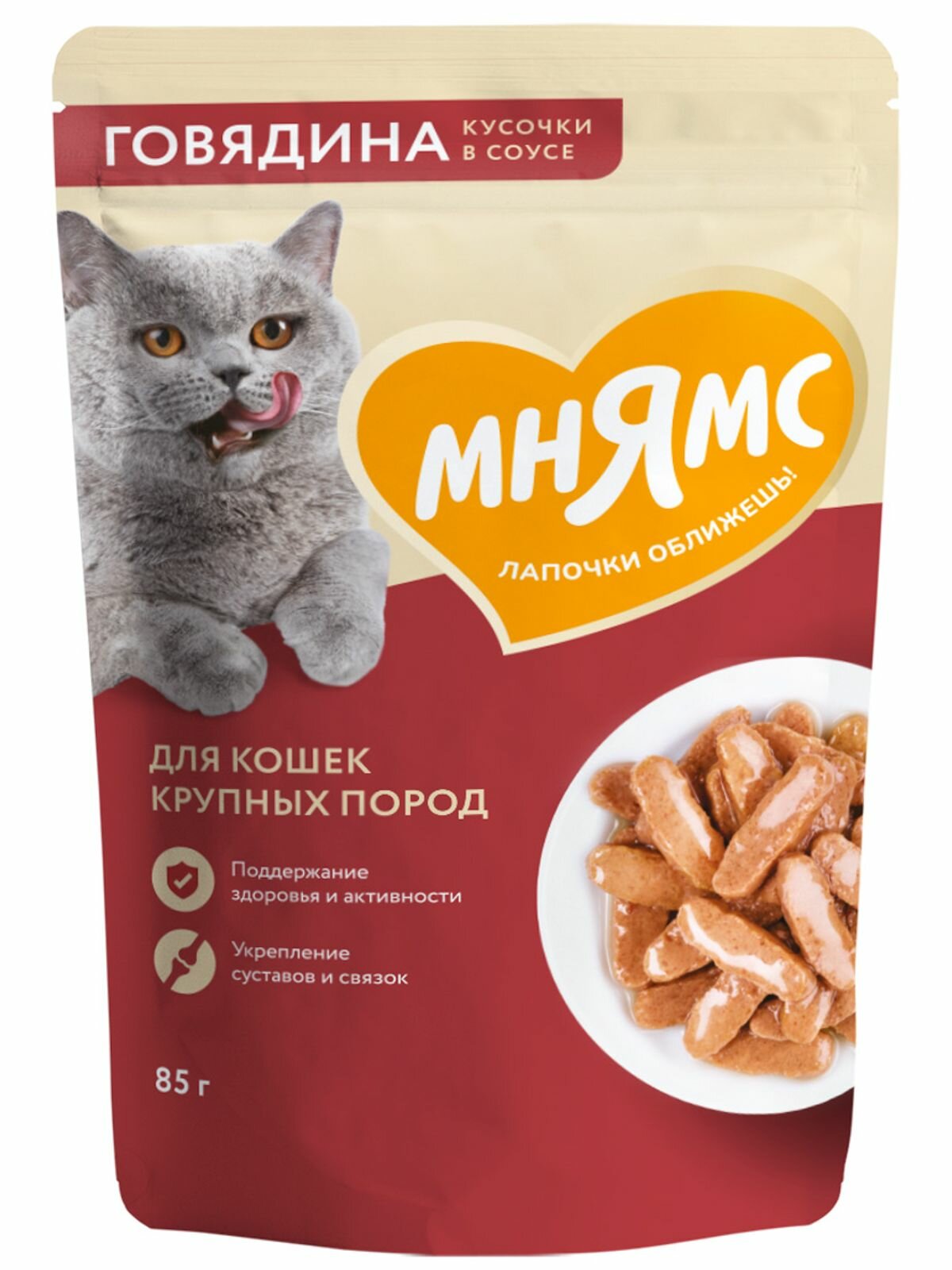 Влажный корм Мнямс Кусочки в соусе с говядиной для крупных кошек 85г × 24 шт.: сравнение цен, характеристики, фото, актуальное наличие и цены.