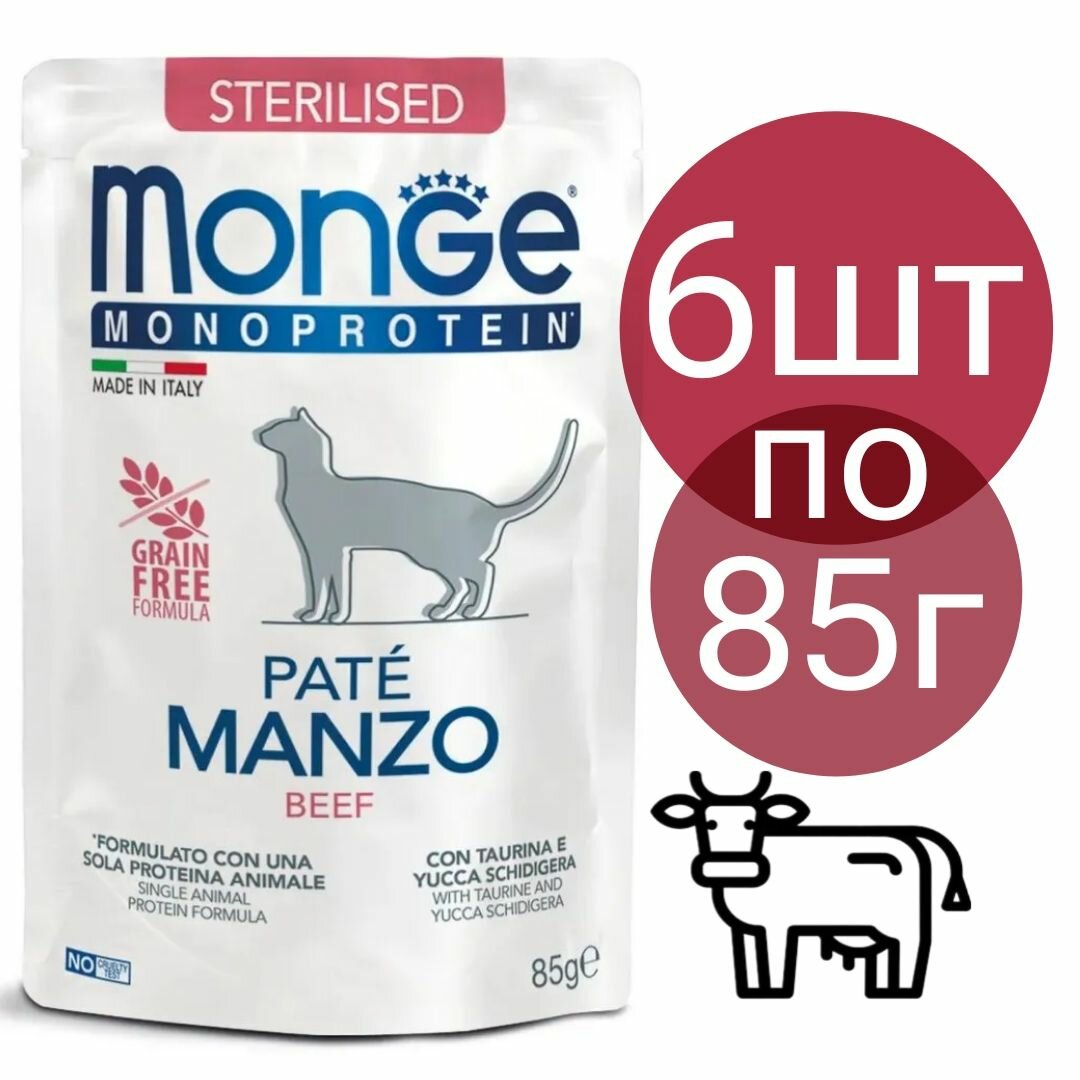 Влажный корм Monge Cat Monoprotein Pouch для стерилизованных кошек , со вкусом говядины (6шт по 85г): сравнение цен, характеристики, фото, актуальное наличие и цены.
