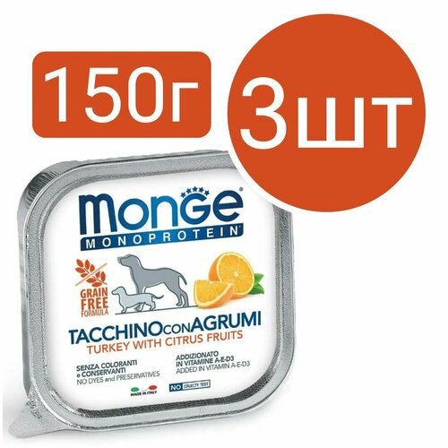 Купить Влажный корм Monge Dog Natural Monoprotein Fruits ламистеры для собак, паштет из индейки с цитрусовыми (3шт по 150г) с доставкой по всей России. Влажный корм Monge Dog Natural Monoprotein Fruits ламистеры для собак, паштет из индейки с цитрусовыми (3шт по 150г): сравнение цен, характеристики, фото, актуальное наличие и цены.
