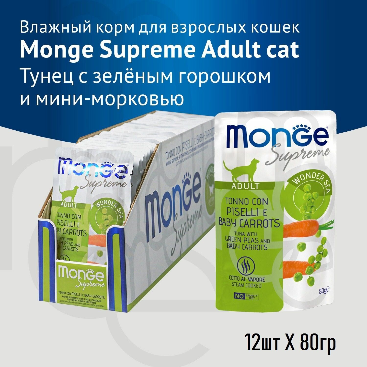 Влажный корм Monge Supreme Adult cat для взрослых кошек с зелёным горошком и мини-морковью 80 г х 12шт: сравнение цен, характеристики, фото, актуальное наличие и цены.