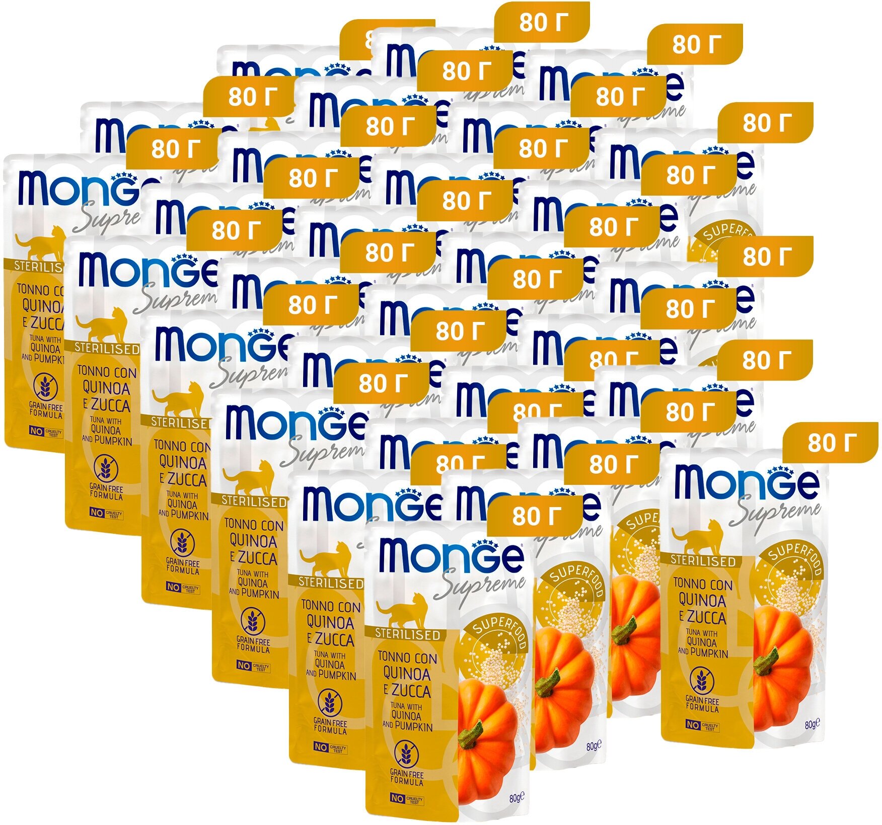 Купить Влажный корм Monge Supreme sterilized cat для стерилизованных кошек из тунца с киноа и тыквой, паучи 80 г х 30шт. с доставкой по всей России. Влажный корм Monge Supreme sterilized cat для стерилизованных кошек из тунца с киноа и тыквой, паучи 80 г х 30шт.: сравнение цен, характеристики, фото, актуальное наличие и цены.