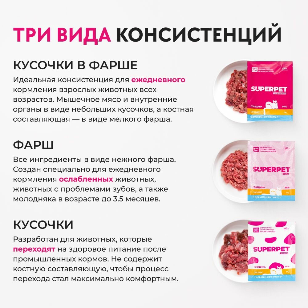 Влажный корм SUPERPET из говядины – полнорационный, сбалансированный, рацион. Легкоусвояемый белок, жиры, витамины, кальций, магний, калий, натрий, фосфор, железо, марганец, медь, цинк и селен, а также различные аминокислоты и биологически активные вещества. Сбалансированный сырой рацион для ежедневного здорового питания.