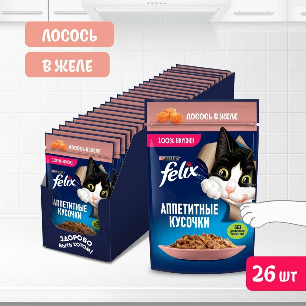 Влажный корм FELIX® Аппетитные кусочки для кошек, с лососем в желе 75 г х 26 шт: сравнение цен, характеристики, фото, актуальное наличие и цены.