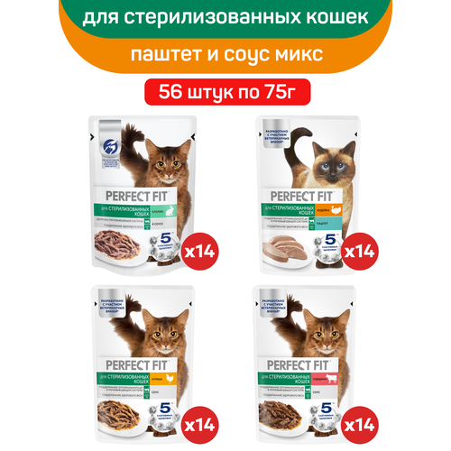 Влажный корм Perfect Fit для стерилизованных кошек, микс вкусов: индейка, курица, говядина, кролик, 56 шт по 75 г: сравнение цен, характеристики, фото, актуальное наличие и цены.