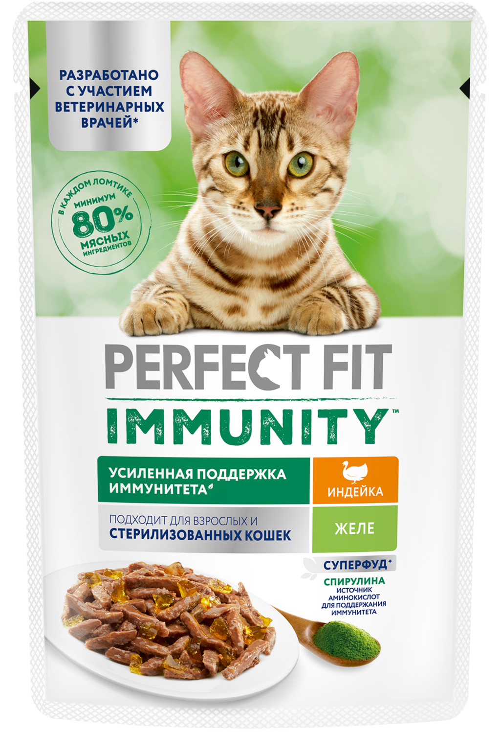 Купить Влажный корм Perfect Fit Immunity для иммунитета кошек, с индейкой в желе и спирулиной, 28 шт по 75 г с доставкой по всей России.