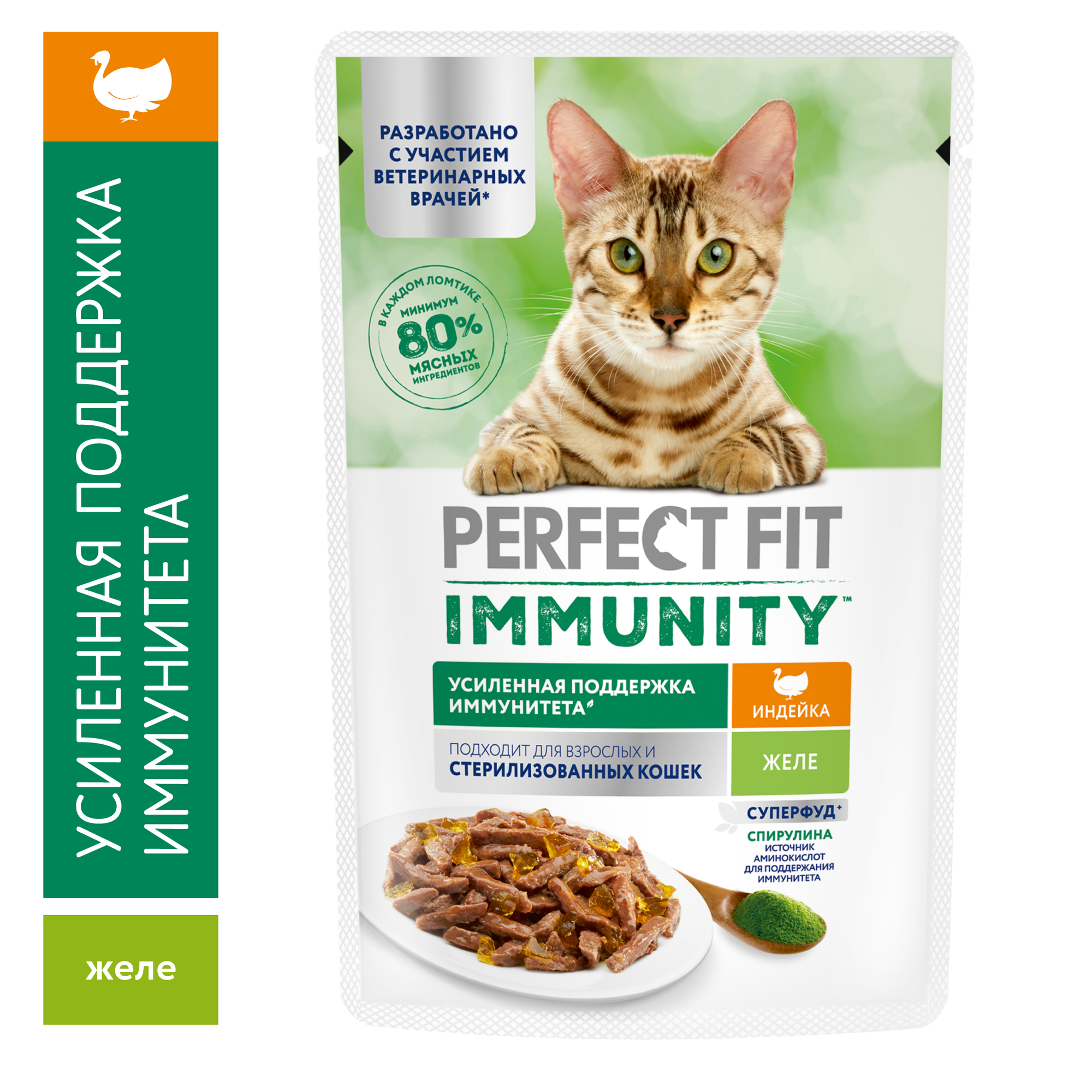 Влажный корм Perfect Fit Immunity для иммунитета кошек, с индейкой в желе и спирулиной, 28 шт по 75 г: сравнение цен, характеристики, фото, актуальное наличие и цены.