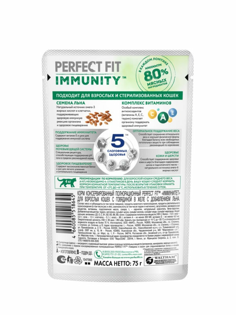Влажный корм Perfect Fit Immunity пауч для поддержания иммунитета кошек (желе) Говядина, 75 г х 56 шт.: сравнение цен, характеристики, фото, актуальное наличие и цены.