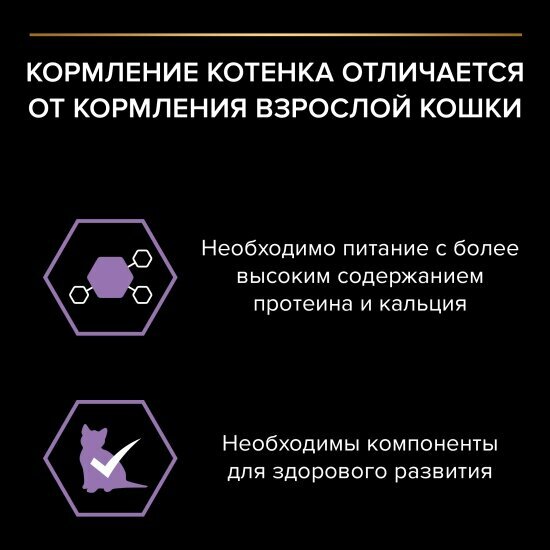 | Дозировка | Для котят от 6 до 12 недель требуется от 2,5 до 3,5 пакетиков корма в день; от 12 до 26 недель — от 3,5 до 4 пакетиков в день; от 26 до 52 недель — 4 пакетика в день, разделенных на два кормления или по желанию. Количество корма и/или интервал приема пищи могут быть скорректированы. Для беременных и кормящих кошек: без ограничений/ столько, сколько кошка сможет съесть, но не менее 4 пакетиков во время беременности и 5,5 пакетиков в период лактации/кормления. |