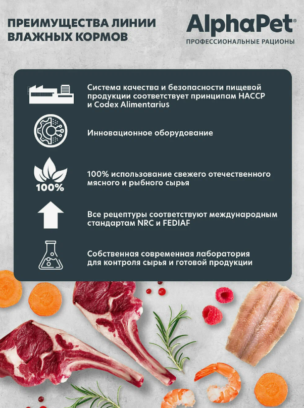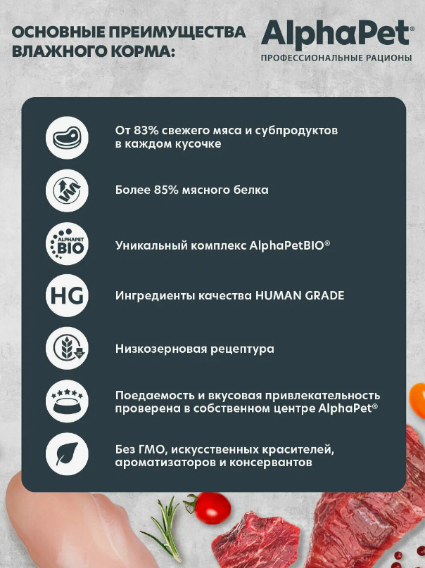 Здоровый и активный питомец – главная задача каждого хозяина. Команда AlphaPet создает и производит полезные корма высшей категории качества Holistiс, давая возможность каждому владельцу быть уверенным в правильном выборе кормления для своего животного. AlphaPet WOW - линейка качественного питания по доступной цене для животных, владельцы которых хотят быть уверены в выборе лучшего качества рациона по разумной цене. Максимально открытый и понятный состав кормов, приготовленных по инновационной технологии из свежего мяса и с содержанием более чем 90% мясного белка! Влажные корма AlphaPet это: Ингредиенты качества Human Graid Уникальный комплекс AlphaPetBio Рис - для чувствительного пищеварения *Не содержит ГМО искусственных красителей, ароматизаторов, консервантов, пшеницу, кукурузу и глютен.