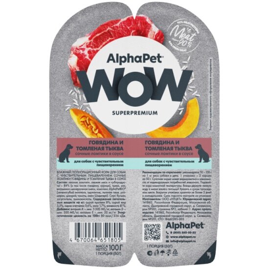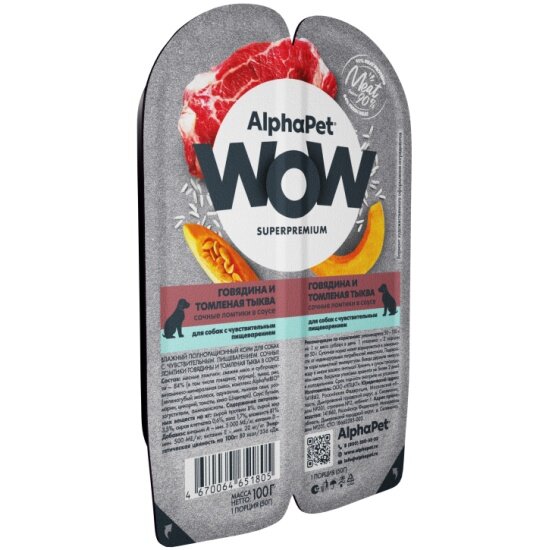 Корм влажный Alphapet WOW Superpremium полнорационный, для собак с чувствительным пищеварением «Говядина и томленая тыква сочные ломтики в соусе», 15шт х100г.: сравнение цен, характеристики, фото, актуальное наличие и цены.