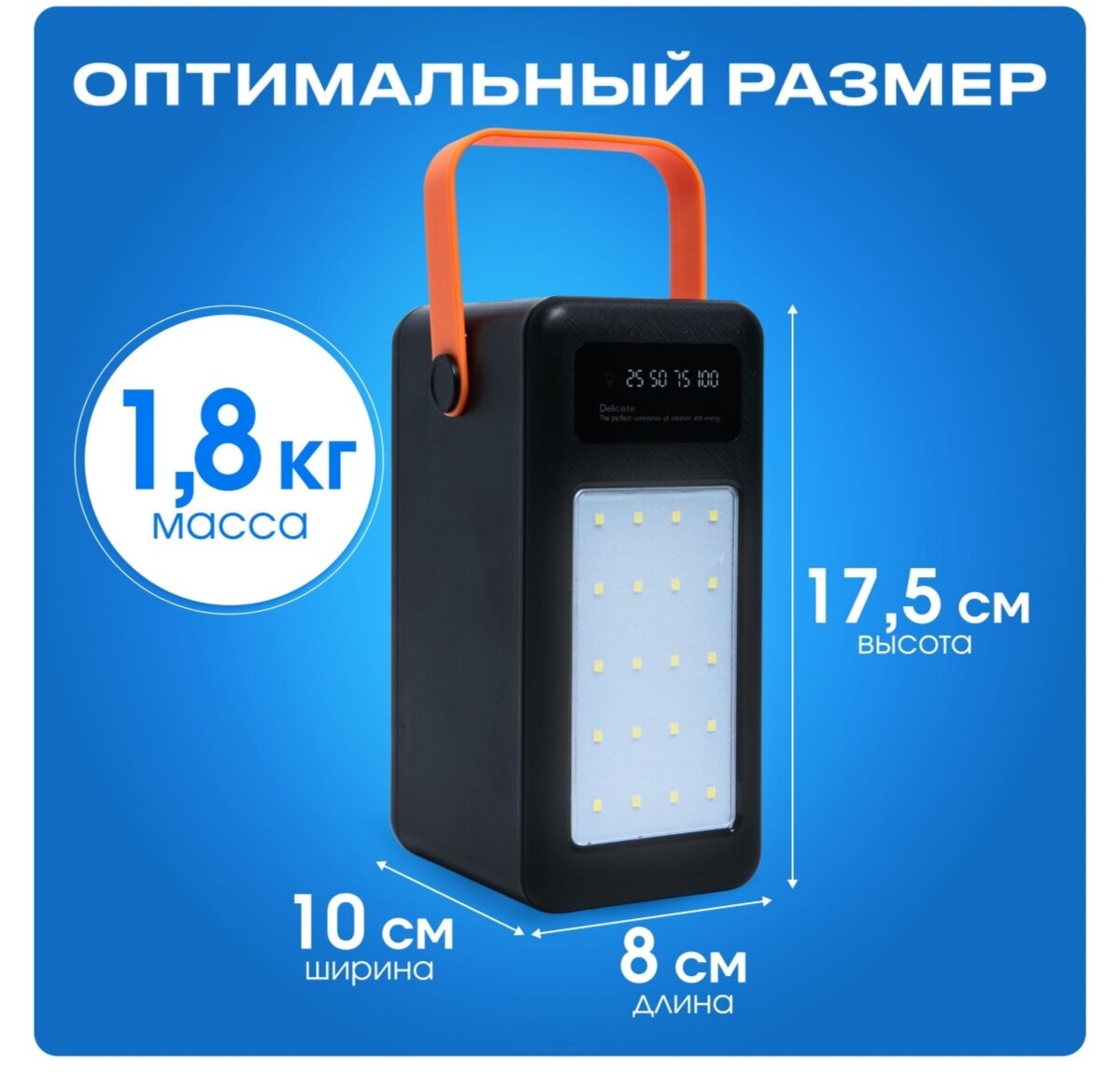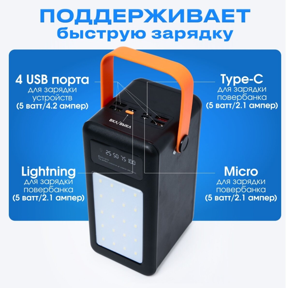 Популярная модель Solar Charger 100000 mAч. Внешний аккумулятор обладает повышенной ёмкостью АКБ 100000 мАч и обеспечит до 20 полных зарядок современного смартфона. Повербанк обеспечит возможность резервной подзарядки, когда нет доступа к электрическим розеткам 220В. Имеется индикация заряда, фонарик. Не нужно теперь носить с собой кучу кабелей и разъемов наш пауэрбанк Solar Power универсален и практичен. Индикация заряда, фонарик, встроенные кабели станут незаменимыми помощниками как в повседневной жизни, так и в путешествии, на рыбалке или просто на отдыхе. Предназначен повербанк для телефона iphone android, а так же для смарт часов, планшета, зарядит наушники, беспроводные зарядки и многое другое. Совместим с iPhone 6, iPhone 6S iPhone 7, iPhone 8, iPhone X, iPhone Xr, iPhone Xs, iPhone Xs max, iPad, iPhone 11, IPhone 11 pro max, IPhone 12, iPhone 12 pro, IPhone 12 pro max, IPhone 13, IPhone 13 pro, IPhone 13 pro max , iphone 14. Дисплей с цифровой шкалой уровня заряда показывает состояние заряда аккумулятора в процентах. Имеет основные уровни защиты: защита от перепадов и скачков напряжения, от перезаряда, от перегрева, от полной разрядки.