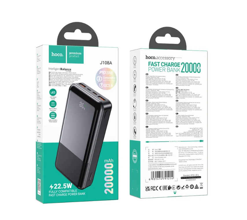 Внешний аккумулятор повербанк Hoco J108A 20000 mAh с быстрой зарядкой и цифровым дисплеем, чёрный - это стильное и мощное устройство, которое подойдет для зарядки различных гаджетов, включая смартфоны и планшеты. Благодаря своей большой ёмкости 20000 mAh, данный аккумулятор обеспечит надежное и долгосрочное питание вашей техники.