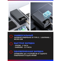 Внешний аккумулятор (повербанк) Demaco A203 на 50000 mah поддерживает множество протоколов и оборудован системой защиты для безопасной зарядки подключенного устройства. При работе одного из портов (USB-A) выходная мощность составляет 5V/2.1A Заряжайте два устройства одновременно. Вход Micro-USB, Lightning, Type-C. Простой и качественный дизайн, где каждая деталь доведена до совершенства. Дисплей, показывает текущий уровень заряда. Поэтому Вы всегда будете знать, сколько энергии у Вас в запасе. Высокоточные резистивно-емкостные компоненты и передовая микросхема делают внешний аккумулятор не только более безопасным, но и повышают коэффициент преобразования, стабилизируют разрядное напряжение и обеспечивают защиту от короткого замыкания. И во время подачи/приема электроэнергии, и при нахождении устройства в режиме ожидания, внешний аккумулятор может легко справиться с избыточным зарядом, высокой температурой или коротким замыканием, что обеспечивает безопасную и эффективную работу устройства. Встроенный фонарь поможет осветить место в темное время суток Вход: Lightning/Micro USB/Type-C DC 5V/2.1A Выход: USB1/USB2 DC 5V/2.1A Вес изделия: 950 г