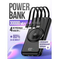 Внешний аккумулятор Power Bank 30000mAh с беспроводной зарядкой и встроенными кабелями