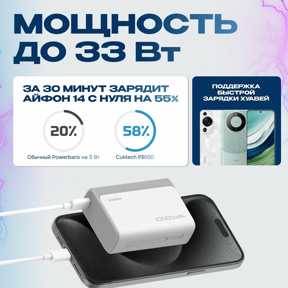 В нашем стремительно развивающемся мире, где каждая минута на счету и постоянная связь очень важна, мы рады представить вам продукт, который не просто отвечает требованиям удобства и скорости, но и превосходит ожидания. Аккумуляторы внешние Cuktech PB100 - ваши незаменимые спутники в жизни, насыщенной событиями и приключениями. С емкостью в 10 000 мАч и мощностью в 33Вт, power bank аккумулятор PB100 предлагает не просто энергию для ваших устройств, а карманную зарядную станцию, способную поддерживать активный образ жизни и готовность к любым вызовам. Очень ценной становится способность одновременно заряжать несколько устройств, которую имеет повербанк для Android и эпл PB100 - будь то ваш смартфон, наушники или планшет. Это означает, что независимо от обстоятельств, вы будете находиться всегда на связи с важными для вас людьми и не тревожась о состоянии заряда ваших электронных помощников. Технологические инновации не стоят на месте, и повербанк 10000mah от Cuktech тому подтверждение. Достаточно большая ёмкость обеспечивает многократную зарядку ваших устройств, а поддержка широкого спектра протоколов быстрой зарядки, включая PD3.0, PPS, QC2.0, QC3.0, QC3.5, AFC, FCP, SCP и UFCS, наделяет внешние аккумуляторы высокой скоростью и совместимостью с большинством современных гаджетов. Легкость и компактность - вот что делает повер банки PB100 идеальными компаньонами в дороге. Пауэр банки можно легко поместить в ручную кладь, ведь они подходят под требования большинства авиакомпаний к провозу электронных устройств, что делает их незаменимыми для путешественников и всех, кто ценит мобильность. Доверие потребителей - величайшая ценность, поэтому павер банк PB100 реализует продвинутые схемы защиты от короткого замыкания, перегрева, перезаряда и высокого напряжения. Это обеспечивает аккумулятор для зарядки телефона не только безопасностью использования, но и способствует продлению срока службы как самого аккумулятора, так и подключенных к нему устройств. Элегантность и прочность также не остались без внимания в модели PB100. Устойчивый к истиранию и царапинам корпус, удобный хват рукой и небольшой вес всего в 195 грамм и исполнение в пастельных тонах, делает этот компактный повербанк триумфом дизайнерской мысли и инженерного искусства. Итак, для тех, кто постоянно находится в движении, кто ценит мобильность, надежность и стиль, аккумулятор - портативная зарядка Cuktech модели PB100 становится не просто гаджетом, а верным спутником, готовым поддержать в любой ситуации. Откройте для себя свободу коммуникаций используя powerbank 10000 мАч PB100 от Cuktech и оставайтесь всегда на связи. •Материал корпуса: высококачественный ABS-пластик • Индикация: LED• Разъемы: USB Type-C, 1 шт, USB Type-A, 1 шт. • Допуск к провозу на самолете: да • Размер устройства, мм: 80 х 57,8 х 28,4 • Вес нетто, кг: 0,195 • Особенности: современный дизайн, большая емкость аккумулятора, мощная и быстрая зарядка, поддержка разных протоколов быстрой зарядки, Quick Charge 3.0, Power Delivery 3.0, компактный размер, возможность провоза в ручной клади на самолете, качественный кабель для зарядки в комплекте, одновременная зарядка двух устройств • Комплектация: внешний аккумулятор, кабель USB Type-C на Type-A, инструкция по эксплуатации Технические характеристики: • Тип аккумулятора: литий-ионный• Количество аккумуляторных батарей: 2 • Тип аккумуляторных батарей: 21700 • Емкость акк