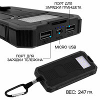 Также аккумулятор оснащен солнечной панелью, что дает возможность заряжать устройство энергией солнца, когда по близости не будет розетки. Мощность солнечной панели 2.4W.