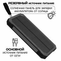 Внешний литий-ионный аккумулятор Power Bank Пауэрбанк Solar Charger на солнечных батареях и со светодиодным фонариком, заявленная емкость POWER BANK 20000 mAh, фактическая ориентировочно 14800 mAh, цвет черный.